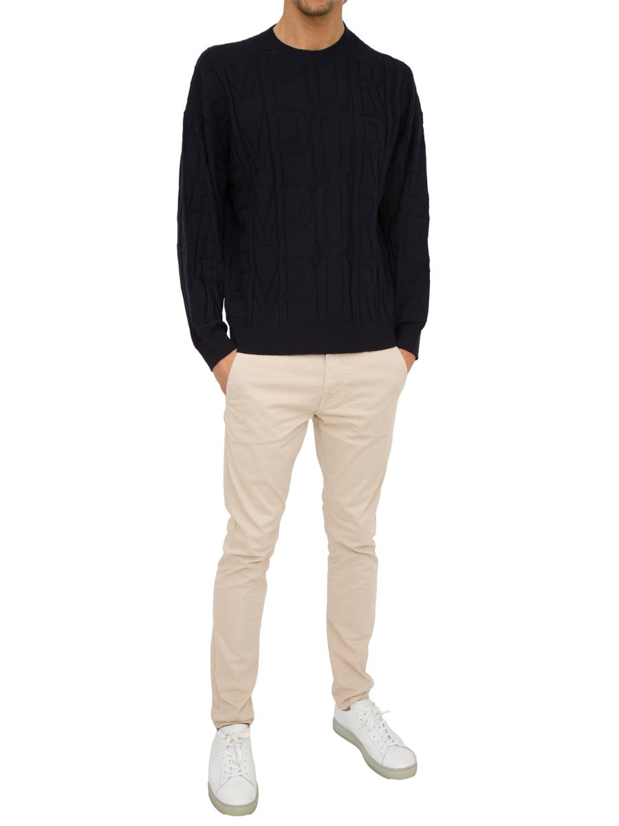 Maglione girocollo da uomo Emporio Armani realizzato in pura lana vergine e impreziosito da maxi logo. La lavorazione a punto rovescio crea due diversi effetti di intarsio: uno con maxi lettering a rilievo e uno con base in maglia rasata e con maxi intarsio frontale, a seconda del colore scelto.