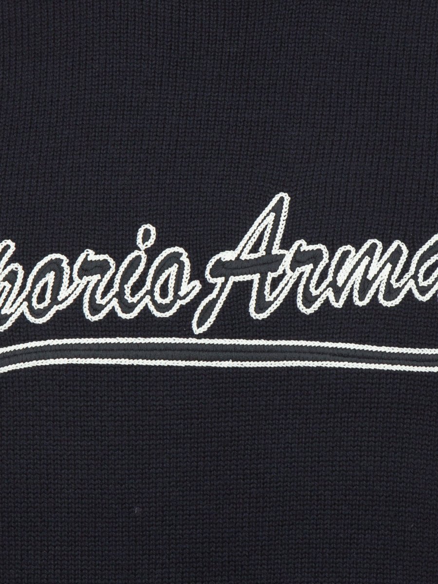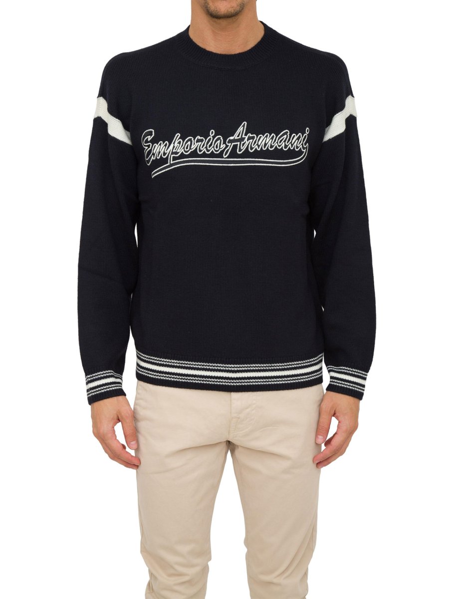 Maglione girocollo da uomo Emporio Armani realizzato in misto lana vergine e impreziosito da ricamo frontale con logo ispirato ai font tipici dell'abbigliamento "college".