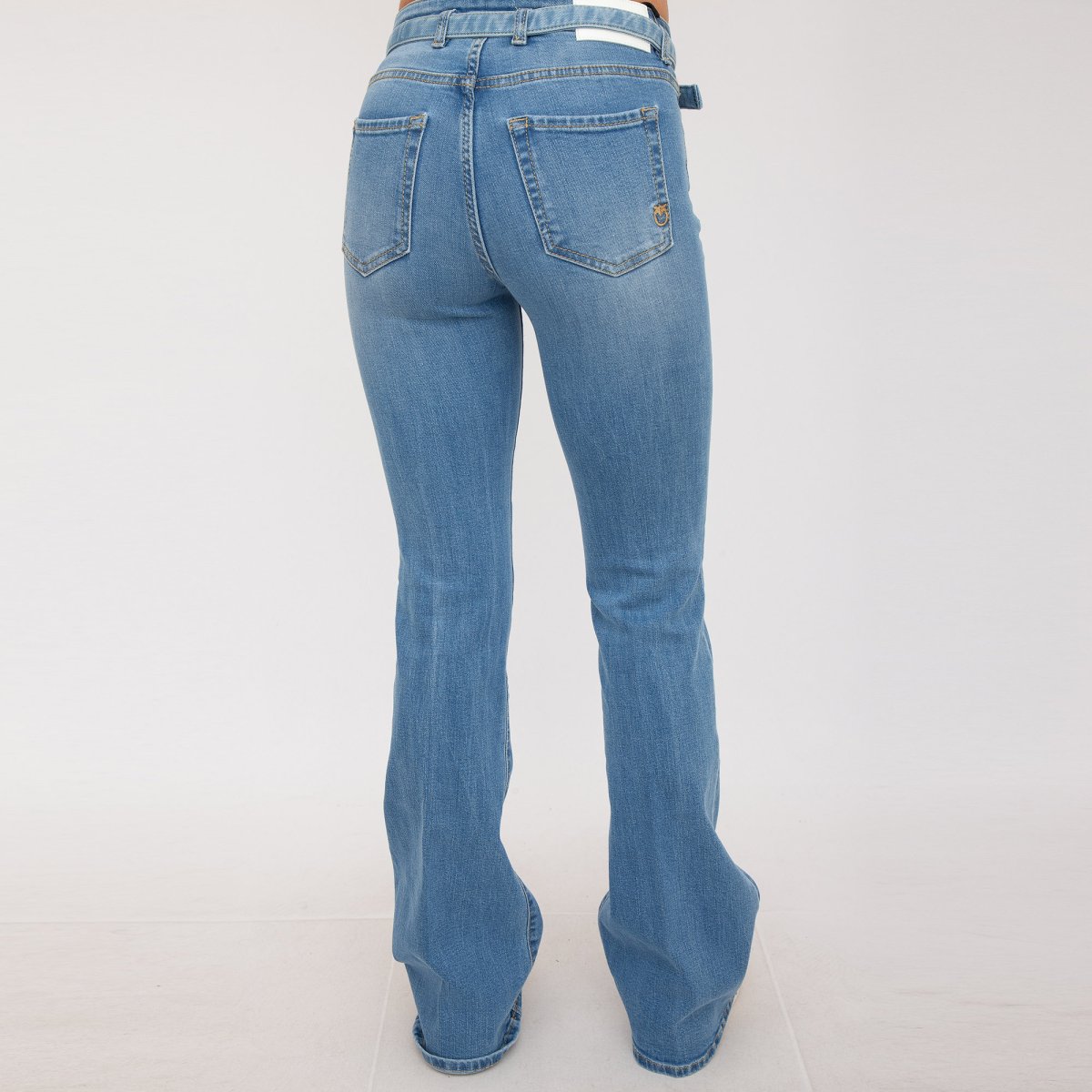 Jeans cinque tasche flare-fit in denim blue stretch lavaggio chiaro. Vita regular con passanti, cintura abbinata nello stesso tessuto con fibbia mini Love Birds Diamond Cut e gamba dalla linea aderente, svasata al fondo. Chiusura con zip e bottone a chiodo in metallo.