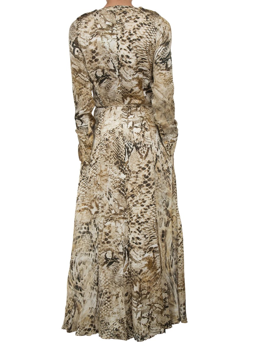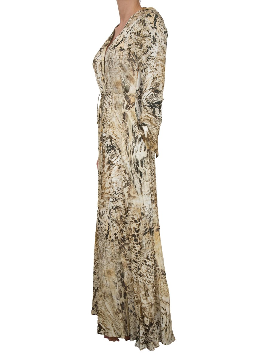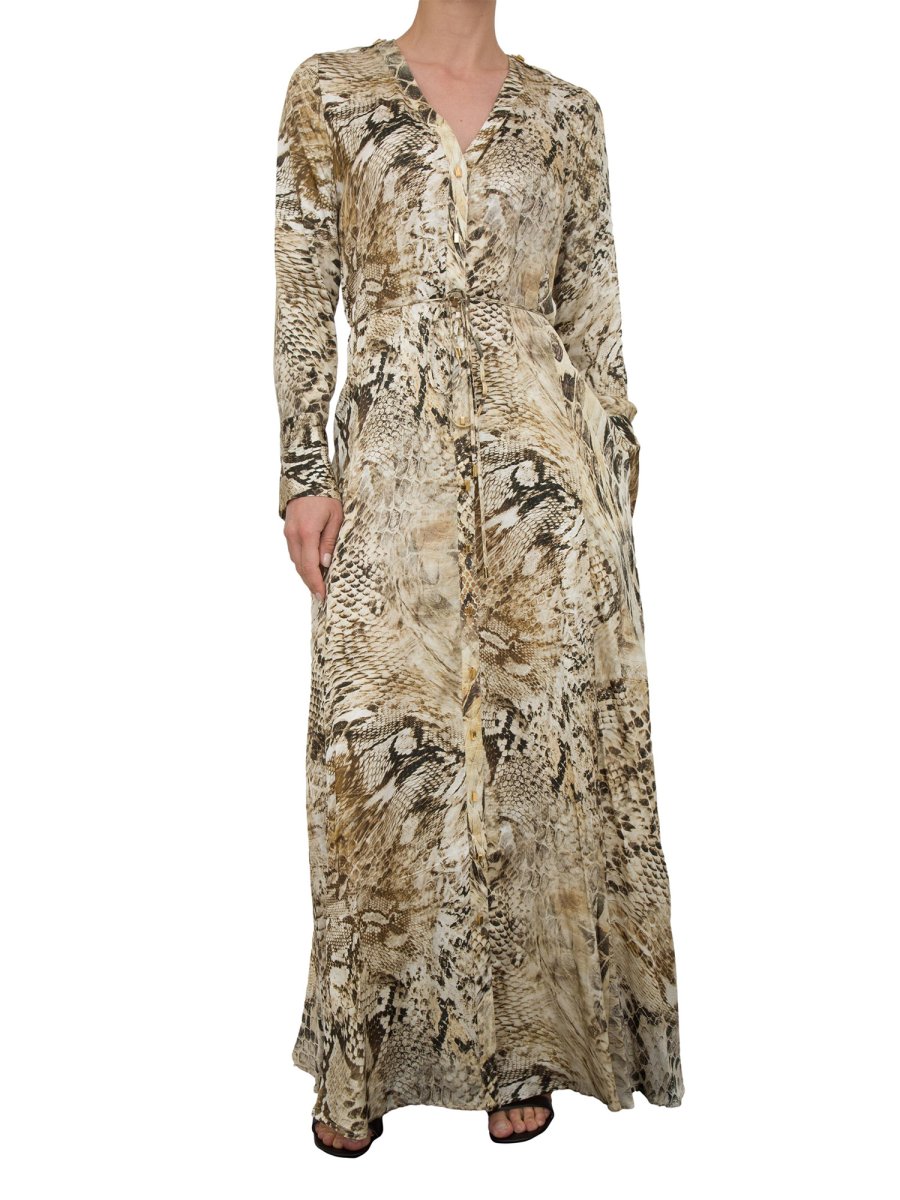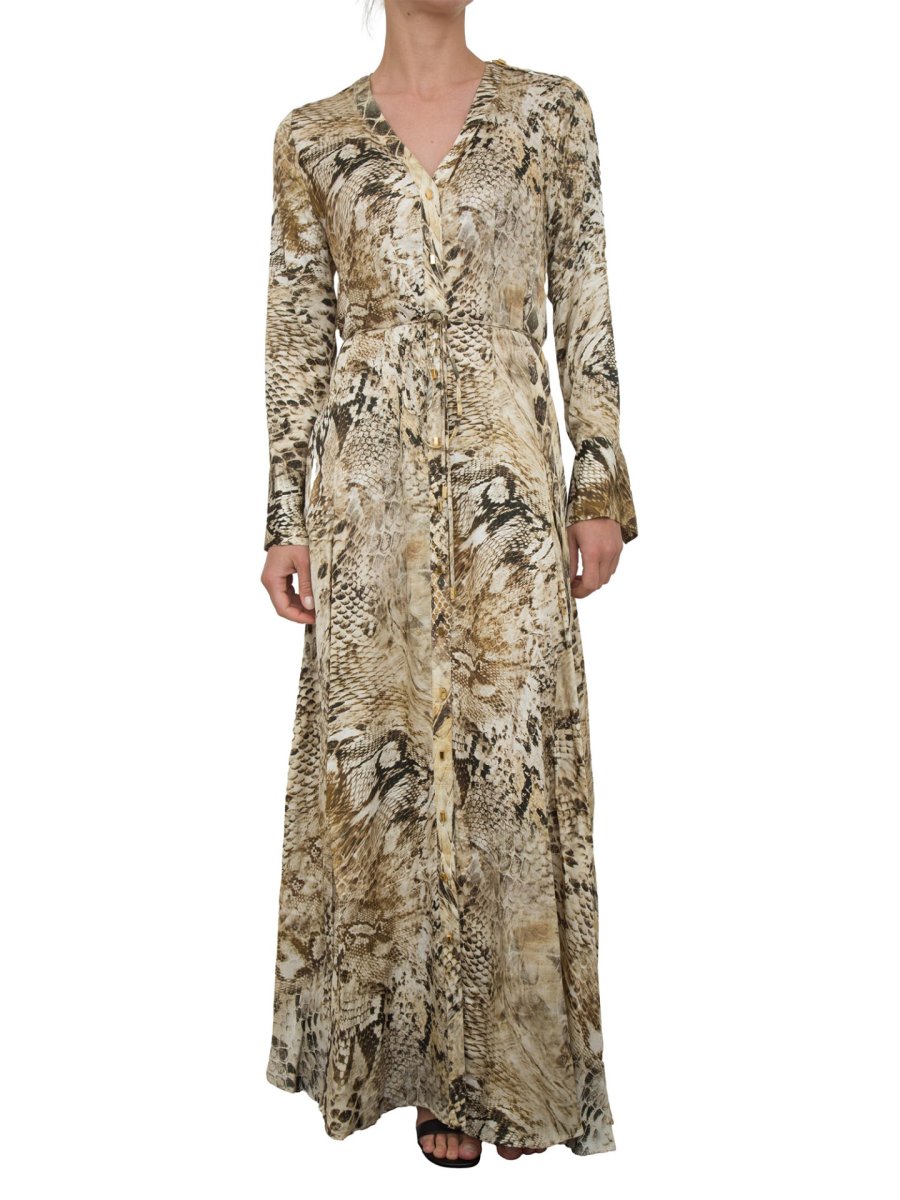 Довга сукня Guess by Marciano з віскози з анімалістичним принтом по всій поверхні. Привабливі V-подібний виріз, довгі рукави, макси-манжети та застібка на гудзики золотистого металу по всій довжині з тонким поясом у тон. Прекрасно підійде для особливого вечора чи церемонії.