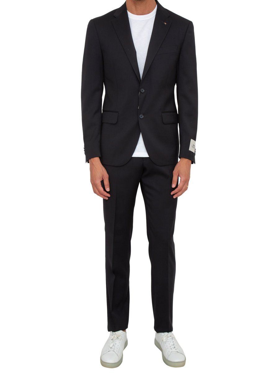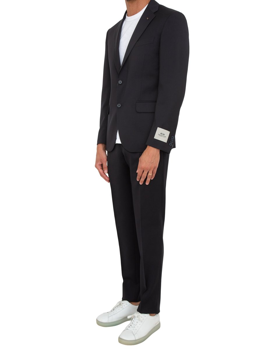 Completo Corneliani realizzato in lana vergine, giacca a due bottoni monopetto vestibilità slim, tasche con pattina, collo rever e tasche pantaloni all'americana.