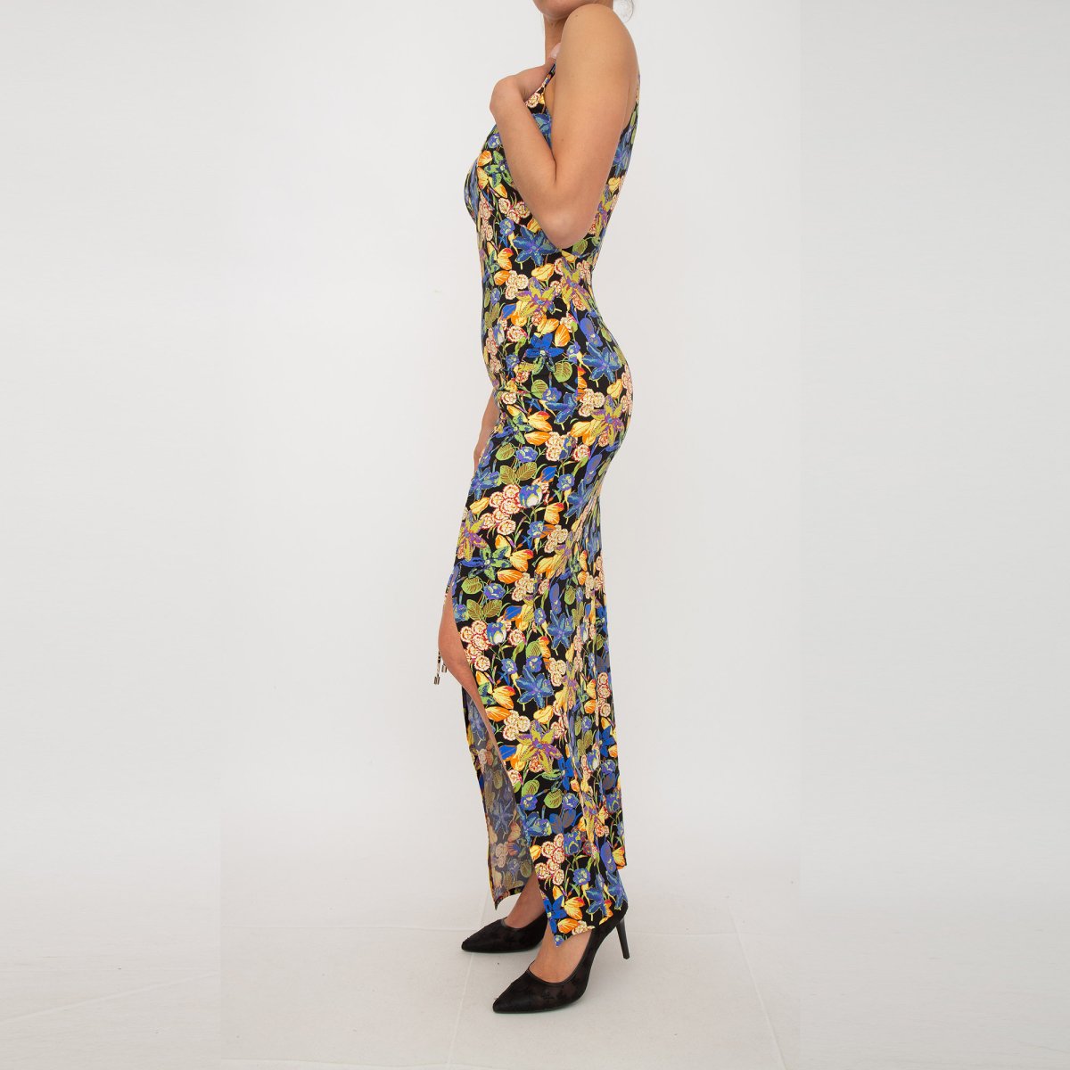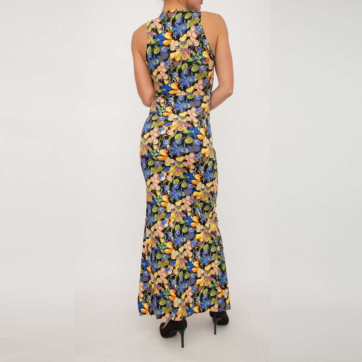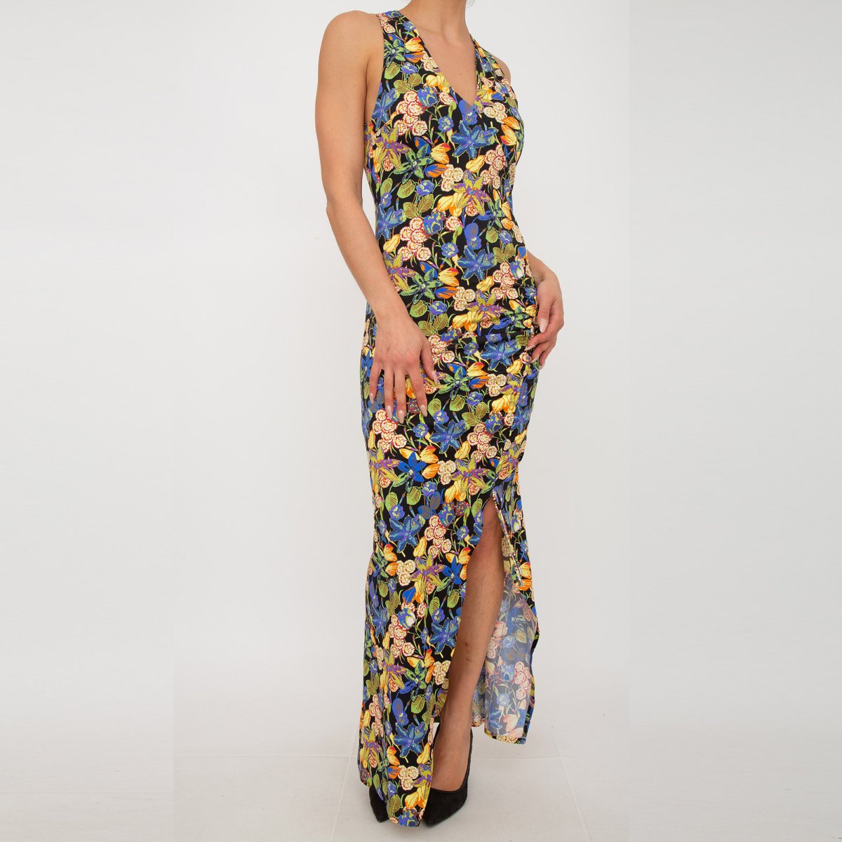 Abito smanicato a fiori, design elasticizzato, dettaglio con arricciature, scollo a V, taglio nella parte anteriore, senza maniche e design lungo.