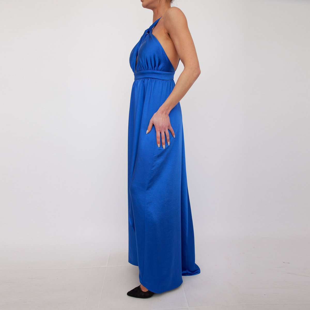 Abito lungo senza maniche in raso stretch. Spalline con dettaglio torchon davanti, piccole arricciature e dettaglio cut-out davanti. Fascia effetto cintura in vita e gonna scivolata con spacco laterale. Chiusura con zip invisibile nel centro dietro.