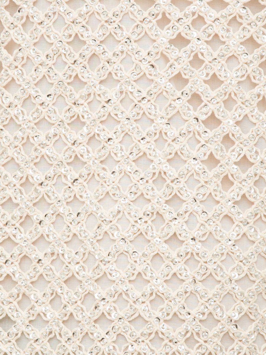 Abito corto in rete tessuta a telaio con fili cordonetto intrecciati, ricamato da paillettes sfaccettate e perline, foderato.