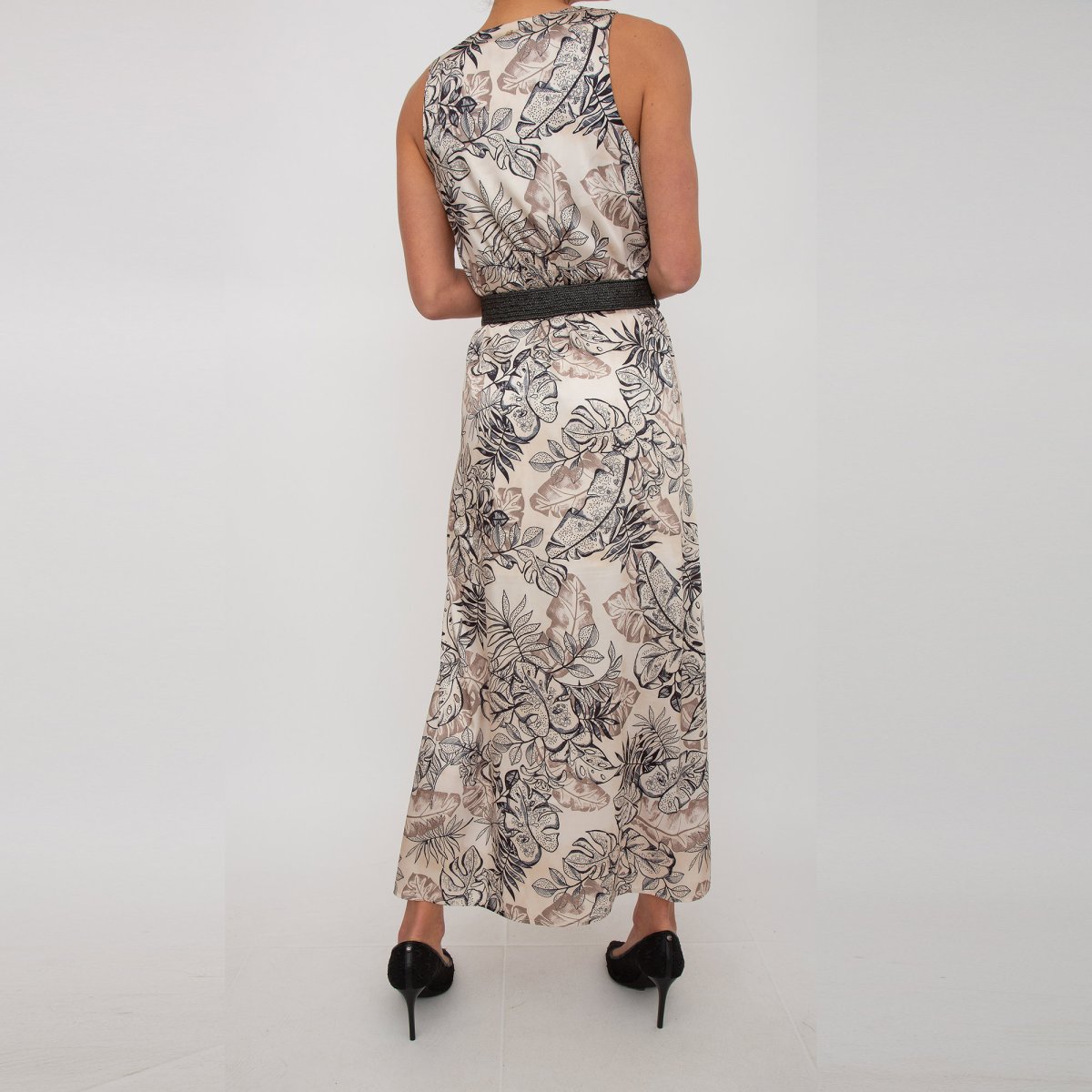 Abito lungo caratterizzato da una fantasia di foglie su tutto il tessuto e da una cintura per avvolgere il punto vita.