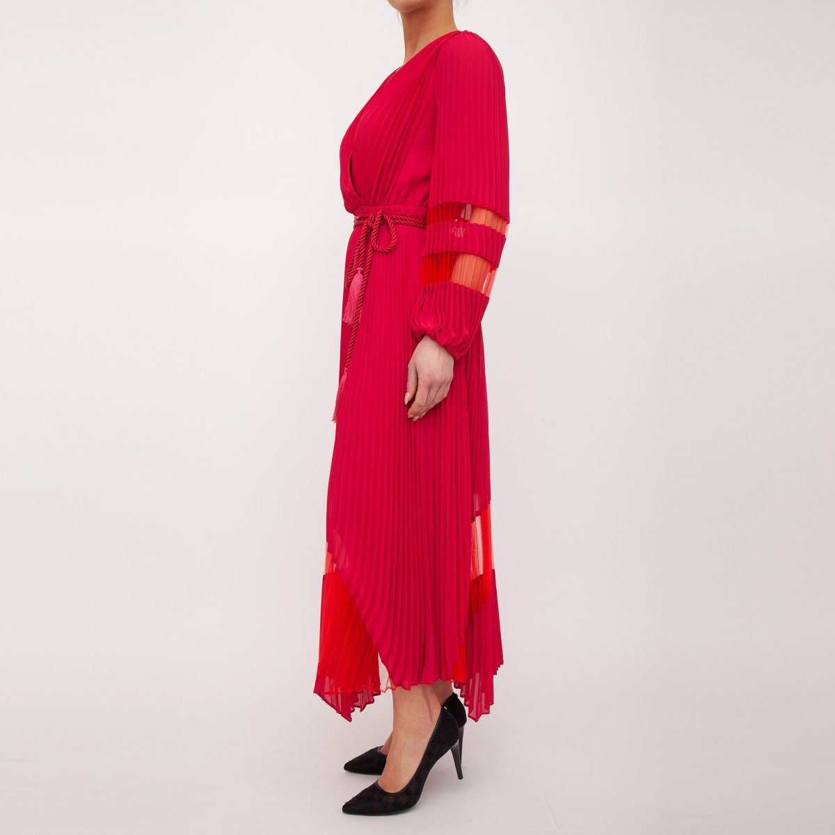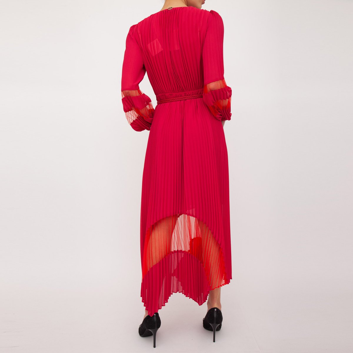 Abito lungo in georgette crêpe plissé con intarsi in tulle a contrasto, maniche con elastico al polso, foderato, cintura abbinata.