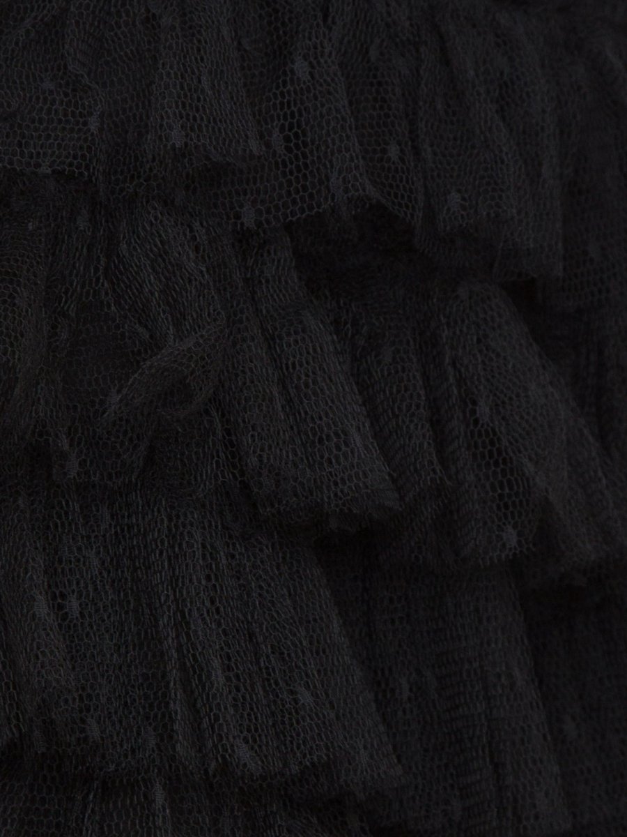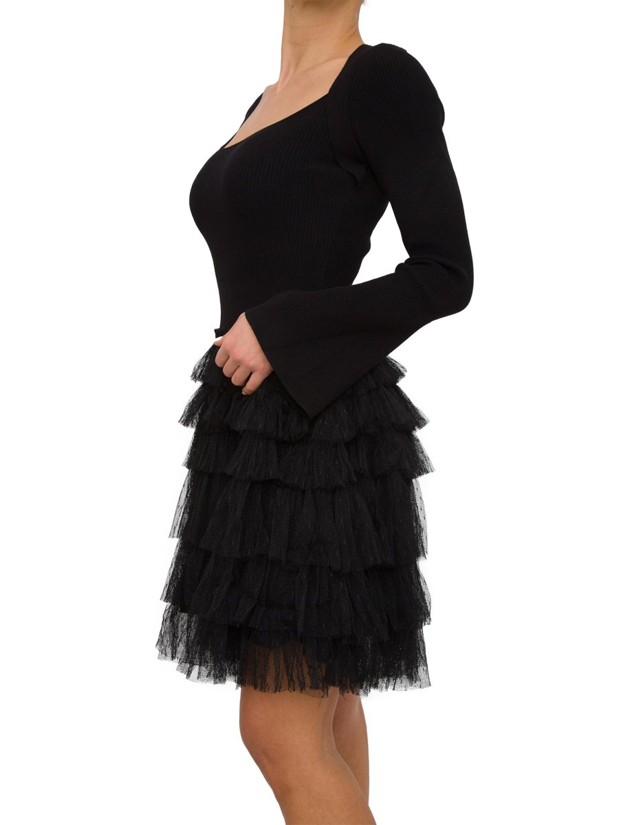 Abito corto in maglia di viscosa stretch a coste, effetto coprispalle, e gonna a balze multistrato in tulle e plumetis.