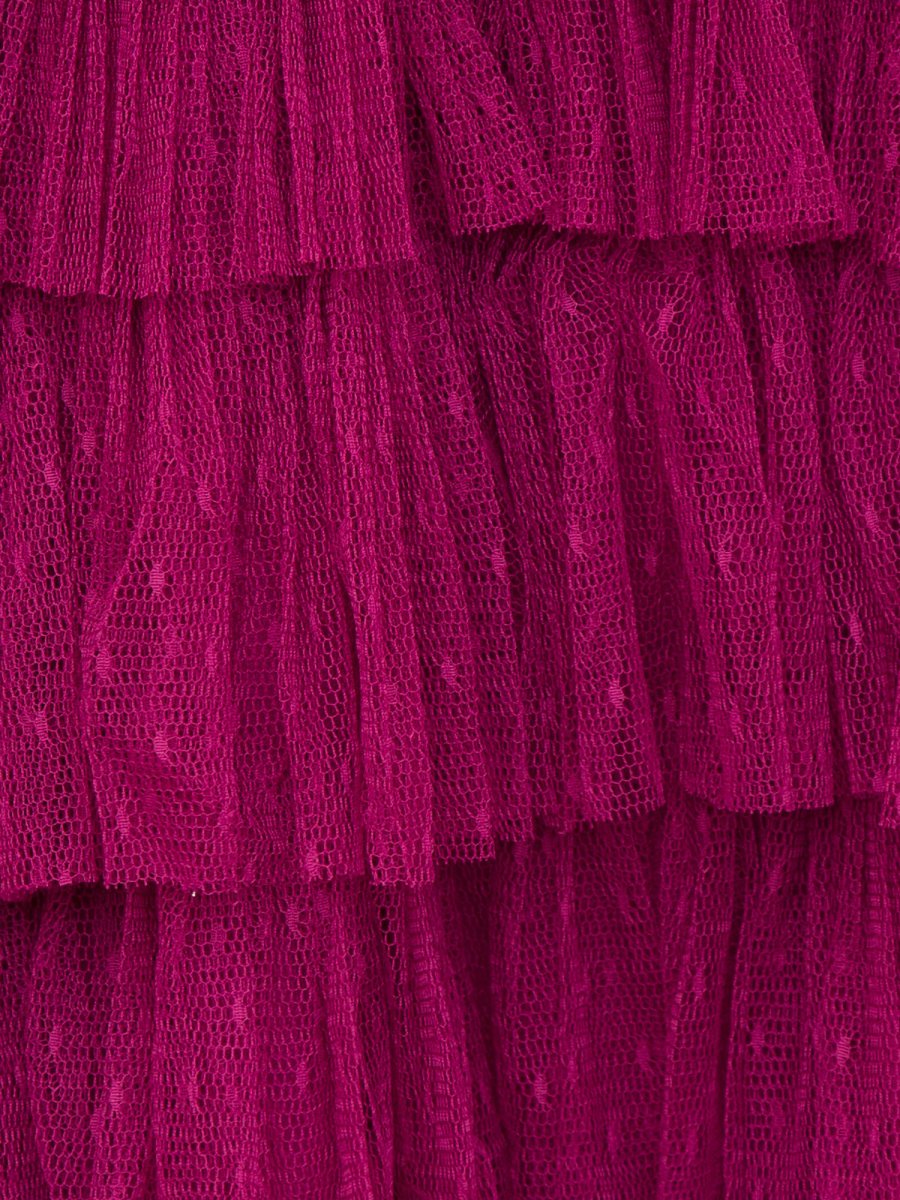 Abito corto in maglia di viscosa stretch a coste, effetto coprispalle, e gonna a balze multistrato in tulle e plumetis.
