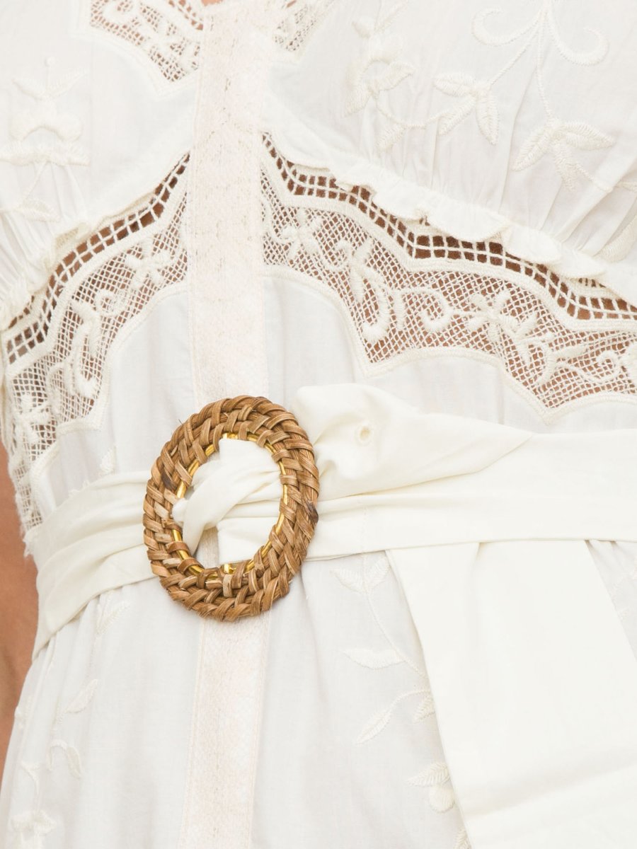 Abito lungo in mussola di cotone con ricami a fiori tridimensionali, dettagli rifiniti da intarsi a rete, dettagli smerlati ricamati a mano, cintura abbinata.