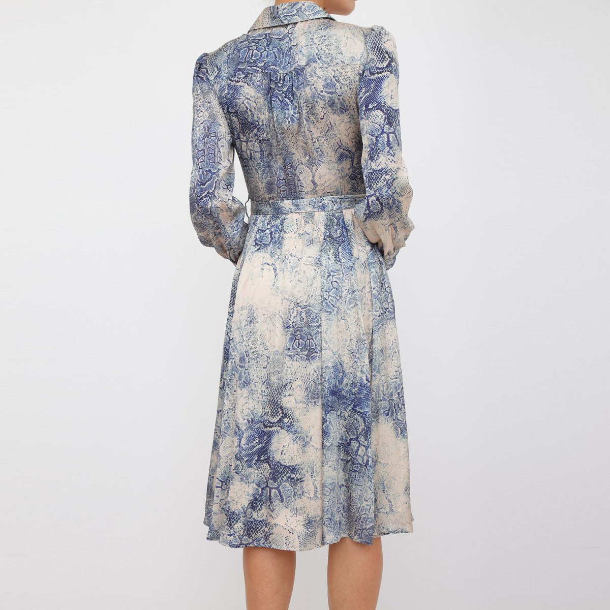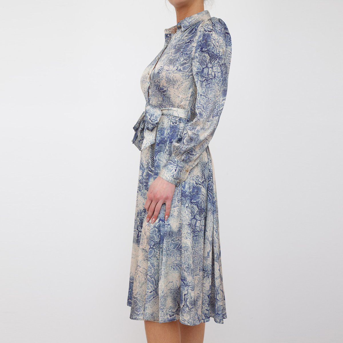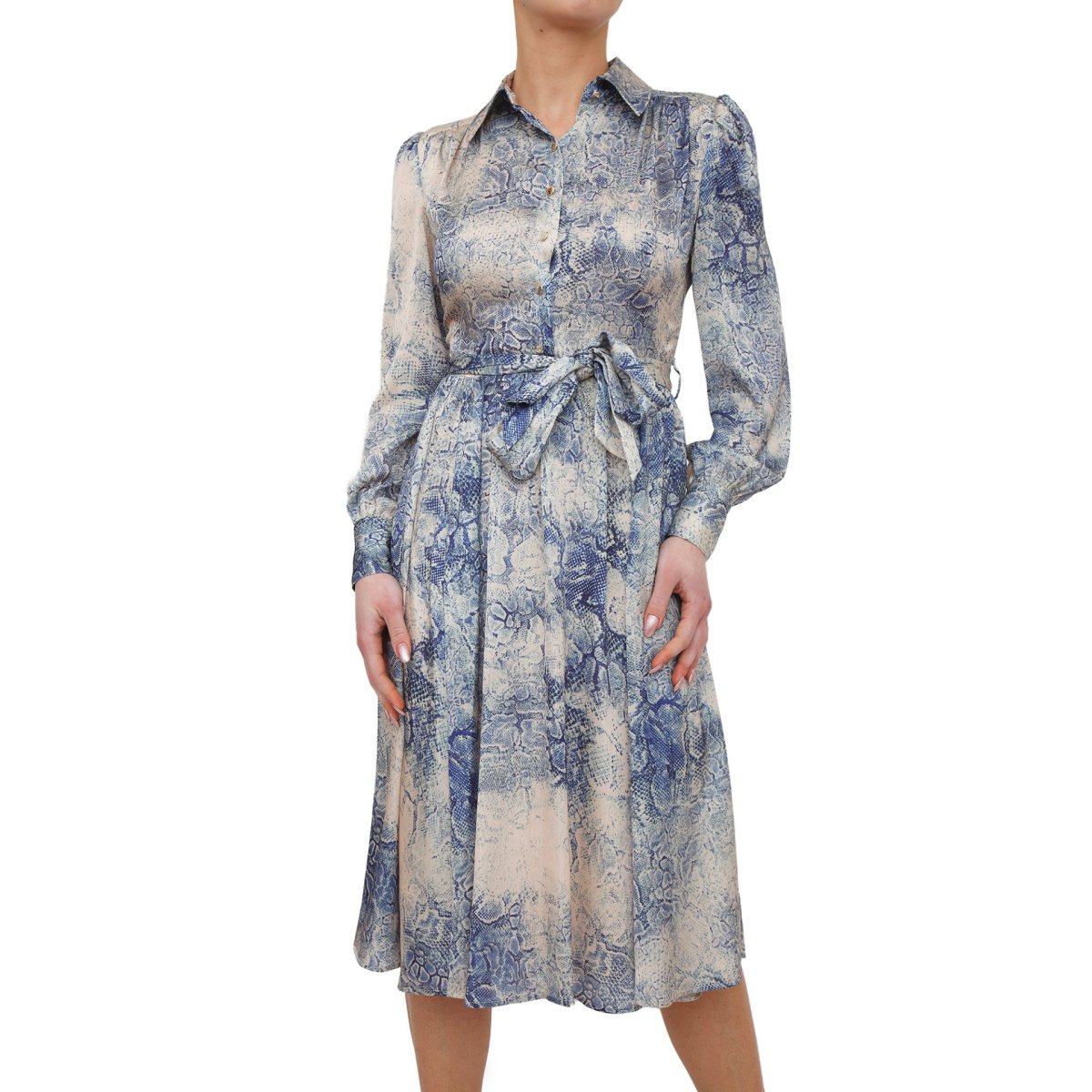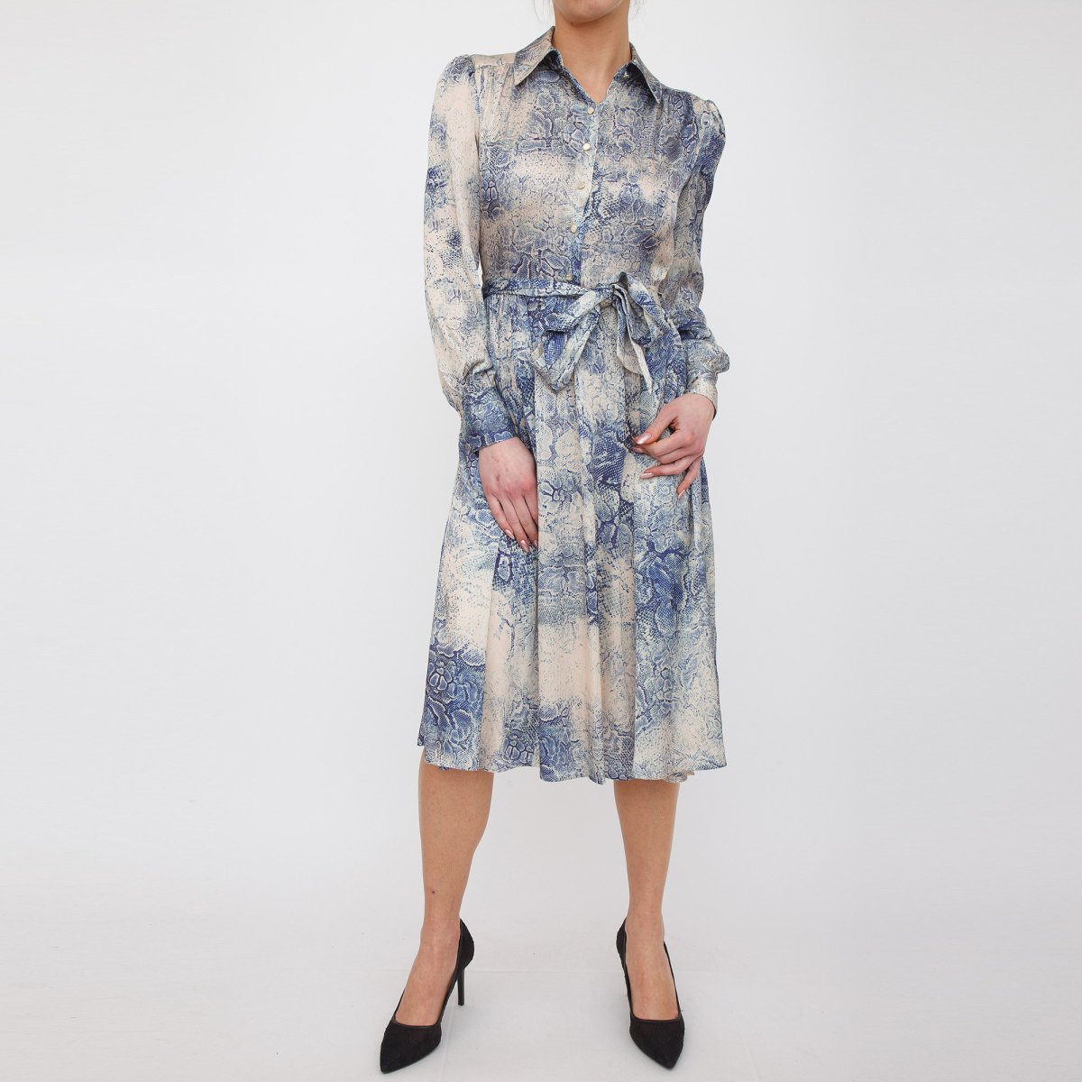 Abito midi in tessuto sintetico, colletto classico, maniche lunghe, modello chemisier e chiusura con bottoni.