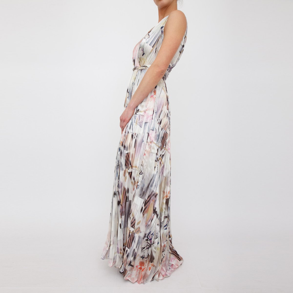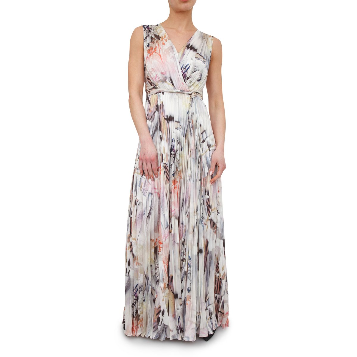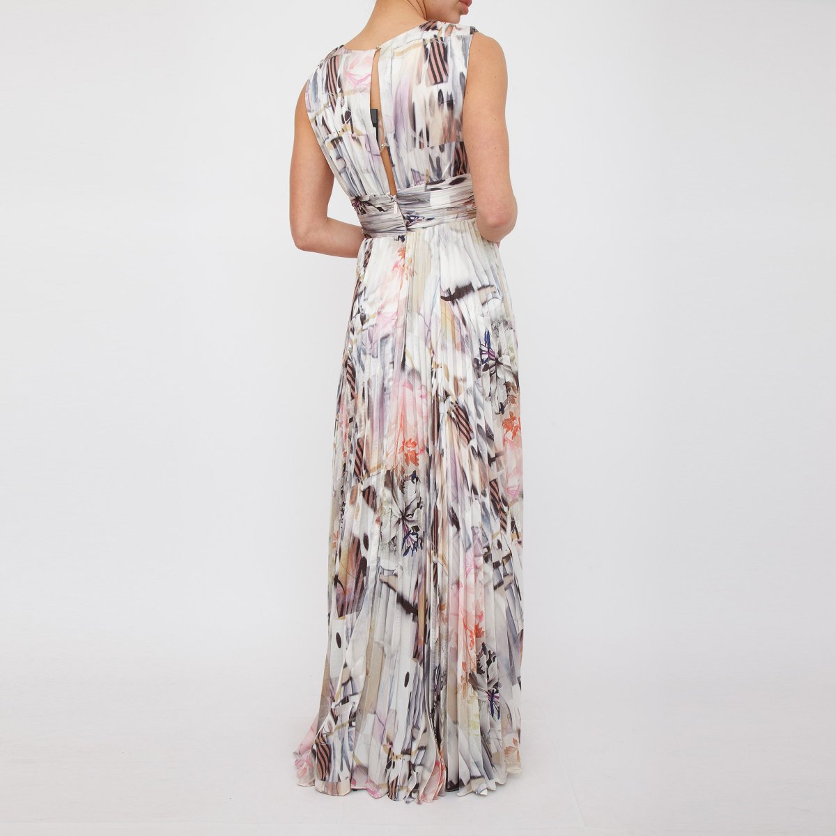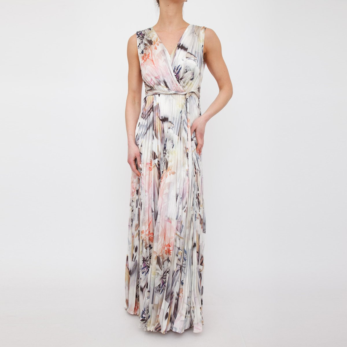 Abito lungo in tessuto sintetico, scollo a V, senza maniche, vestibilità regular e chiusura con cerniera lampo.