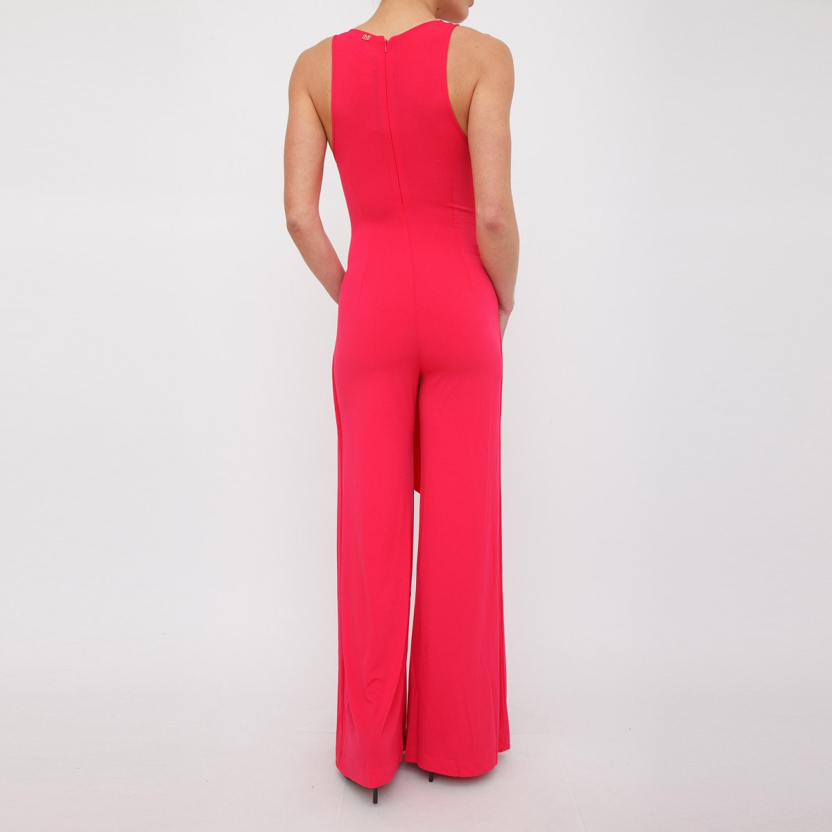 Tuta in tessuto sintetico, scollo a V, senza maniche, vestibilità regular, wide leg e chiusura posteriore con cerniera.