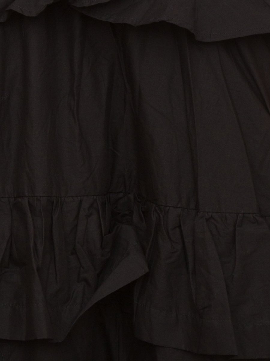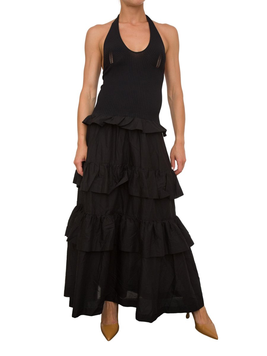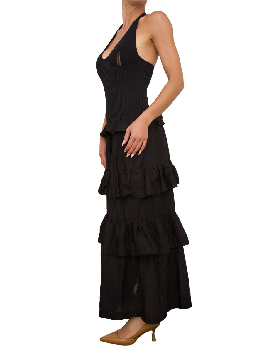 Abito lungo in maglia di misto viscosa a costine e gonna in mussola con volant a strati, scollatura a V, foderato.