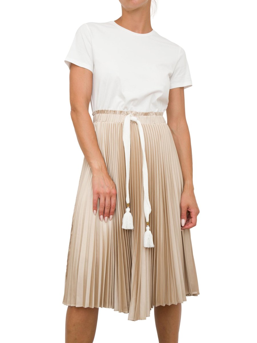 Abito longuette in jersey di cotone con gonna in raso plissé con spacchi, elastico con coulisse e nastro in vita.