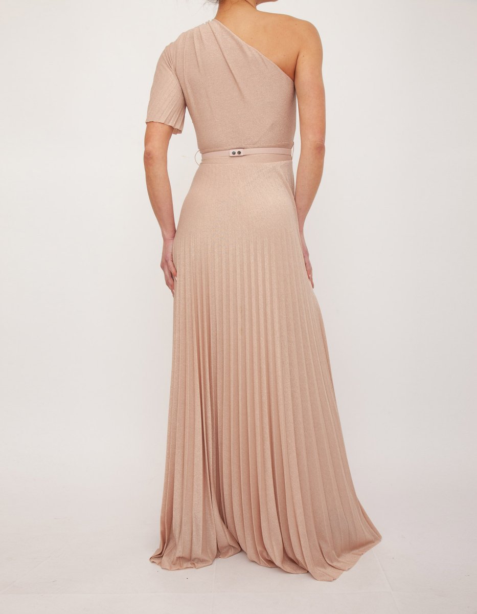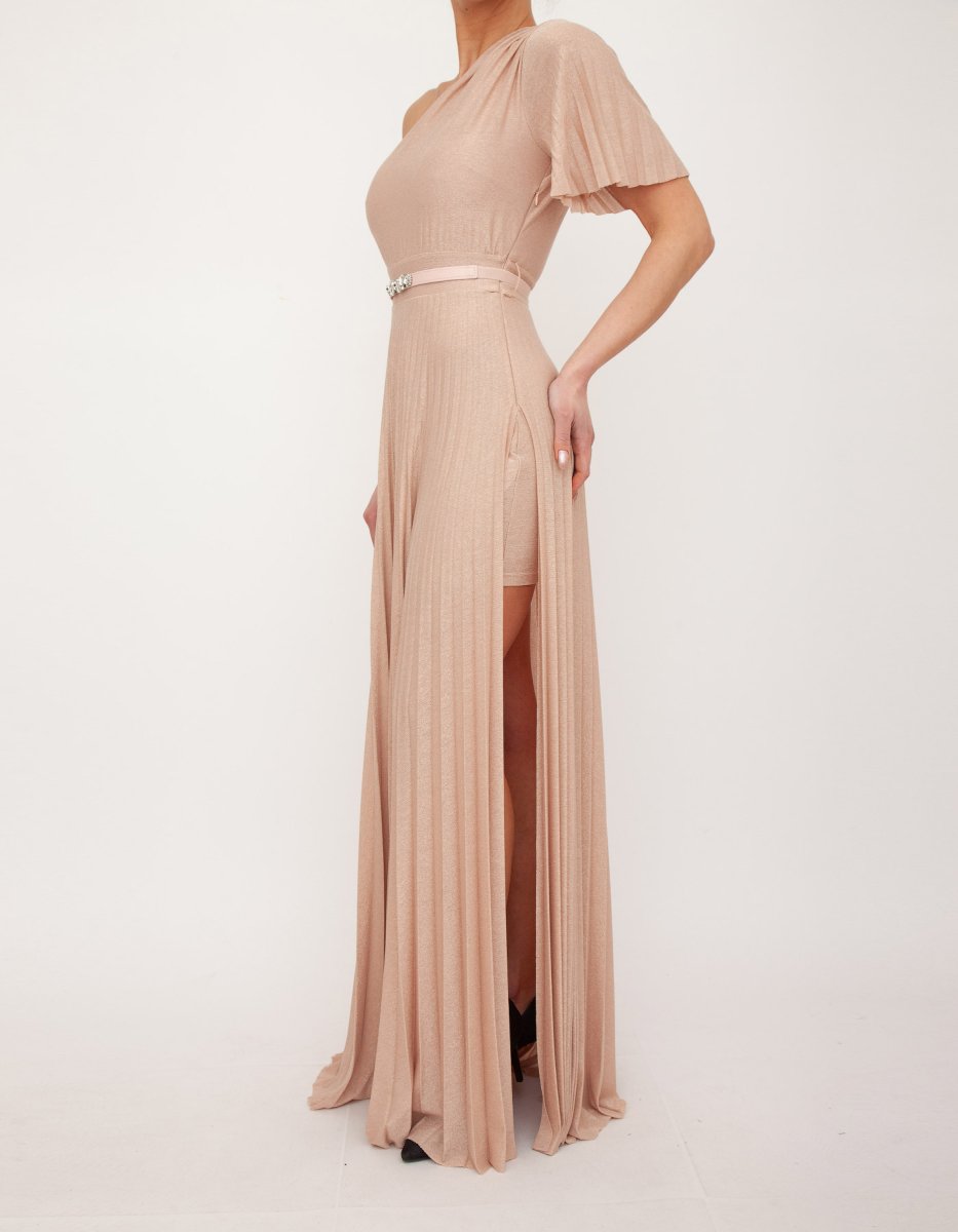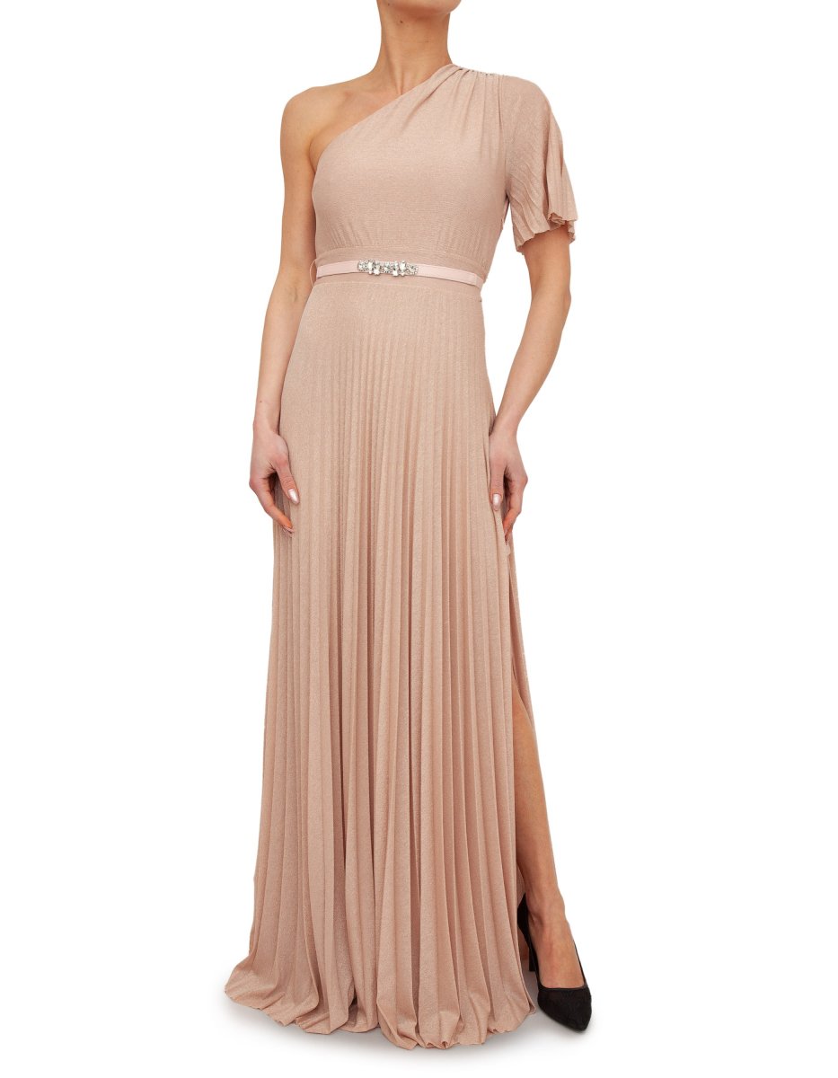 Vestito da cerimonia in jersey di misto viscosa stretch, interventi in lurex®, motivo plissé, taglio monospalla, manica a tre quarti, apacco sul lato, cintura con strass in abbinamento e chiusura con zip invisibile sul fianco. Made in Italy.