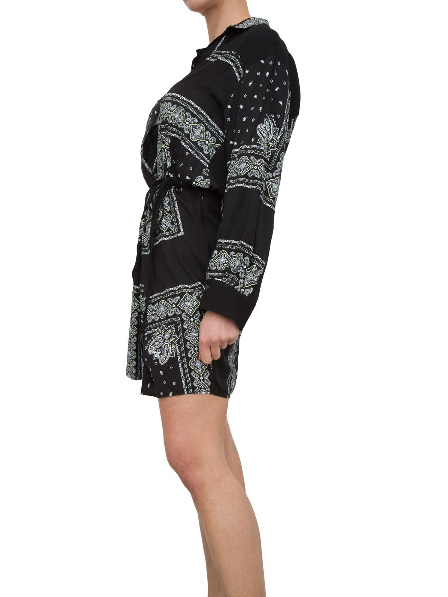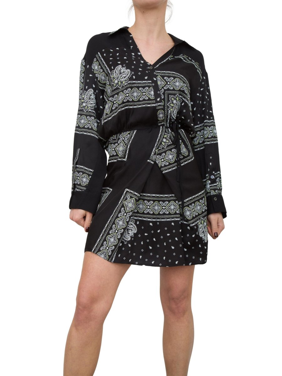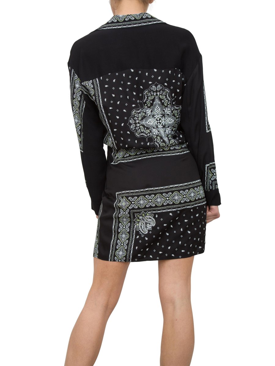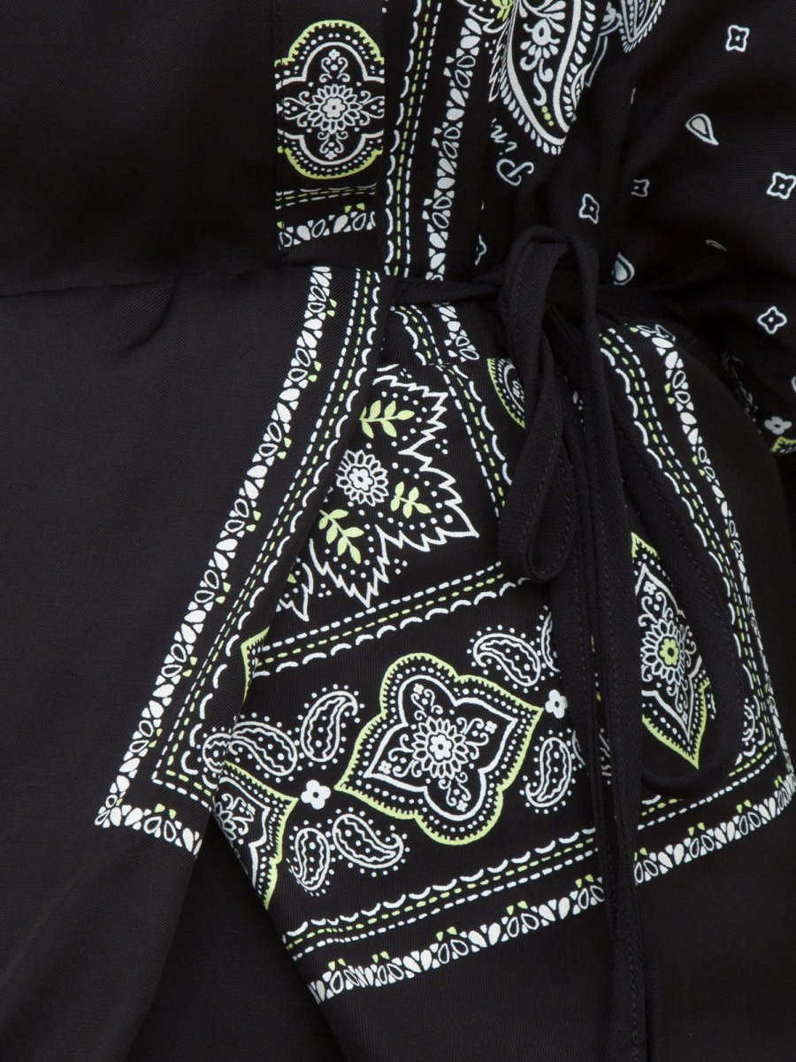 Коротка сукня-сорочка з віскозної саржі з принтом бандани пейслі та вставками з легкого віскозного жоржету. Міні-сукня-сорочка імітує ефект сукні-халат, де сорочка перехрещується зверху, а коротка спідниця з кишенями з боків також перехрещується спереду та зав'язується збоку.
