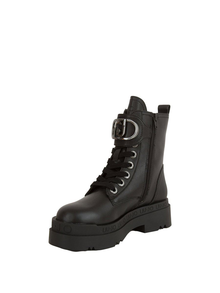 Anfibi Liu-jo in vera pelle, maxi cinturino con logo metallico, fibbia regolabile, occhielli logati, lacci piatti e chiusura con zip sul lato interno. Suola platform con logo inciso, altezza suola: 5 cm, altezza gambale: 15,5 cm.