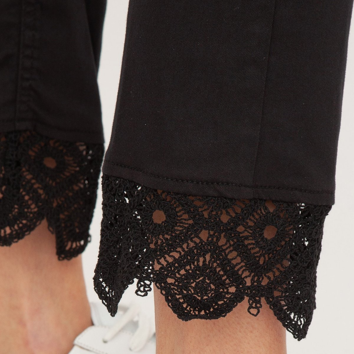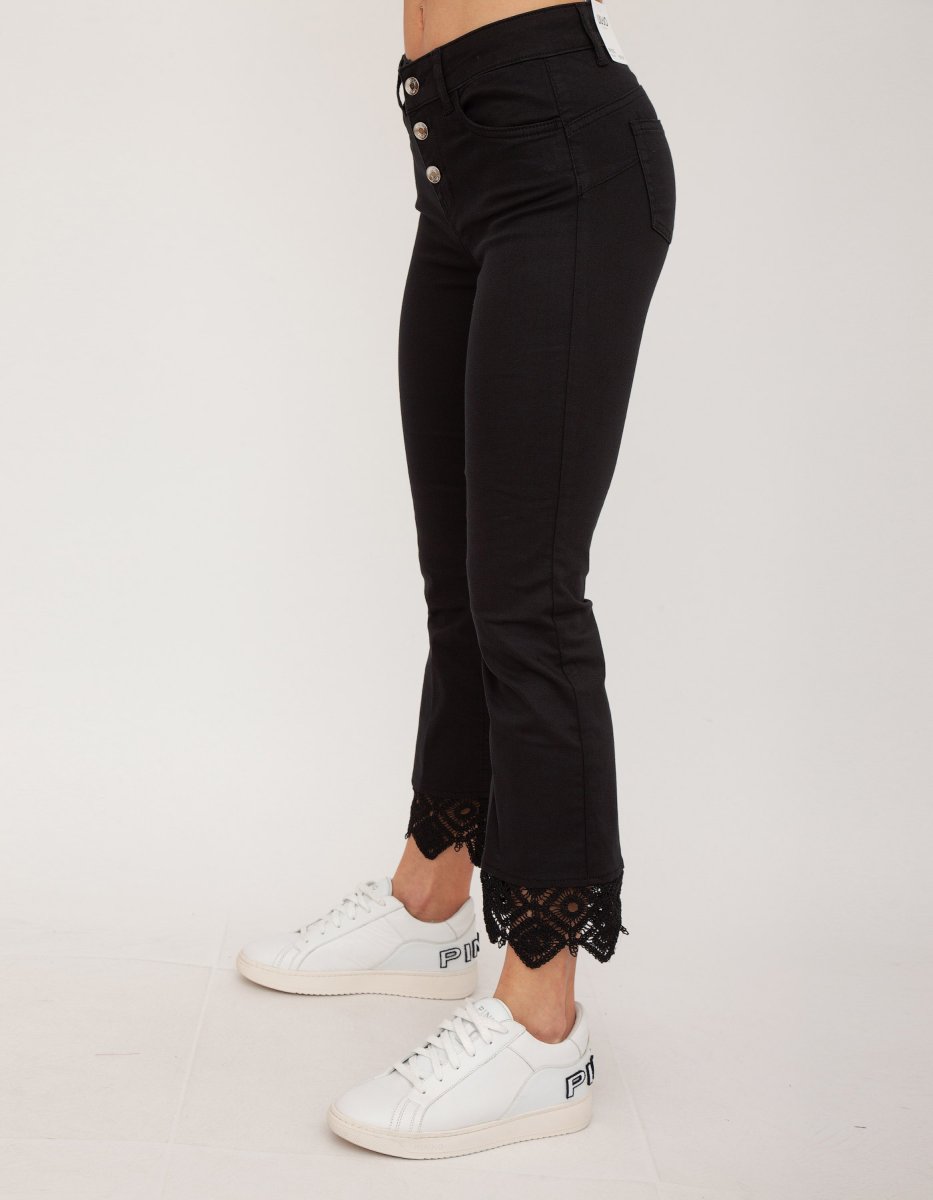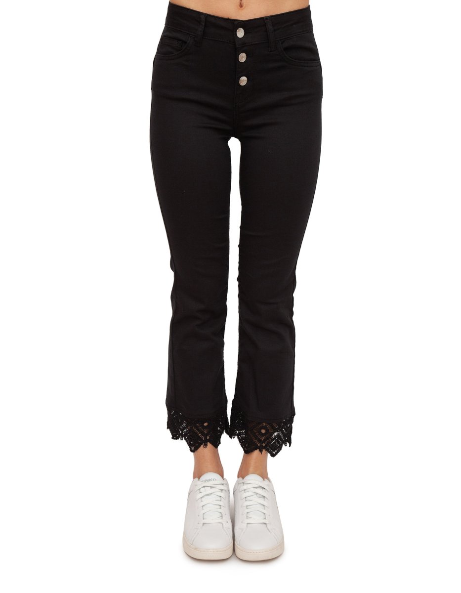 Pantaloni Bottom Up in gabardina di cotone stretch, motivo ricamo al fondo, vestibilità cropped, modello cinque tasche, vita alta, salpa e label logata in metallo sul retro e chiusura con bottoni a vista.