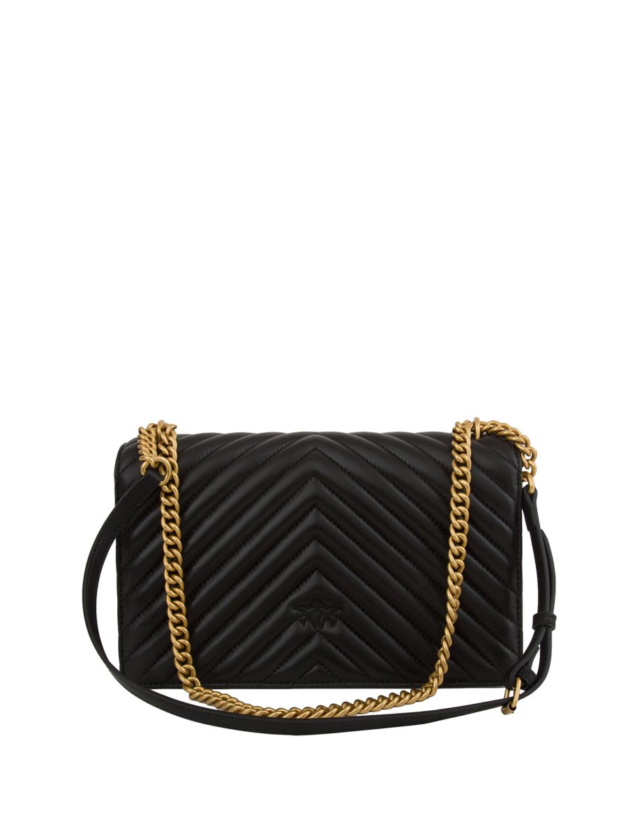 Borsa Pinko Classic Love Bag One in nappa trapuntata con motivo chevron. La chiusura è completata dall'iconica fibbia Love Birds Diamond Cut in metallo. L'interno è foderato in microfibra scamosciata e comprende tramezza chiusa con zip e tasca a parete in pelle. La tracolla combina la classica catena rotonda al pratico spallaccio in pelle regolabile. Altezza: 16 cm Larghezza: 8 cm Lunghezza: 27 cm