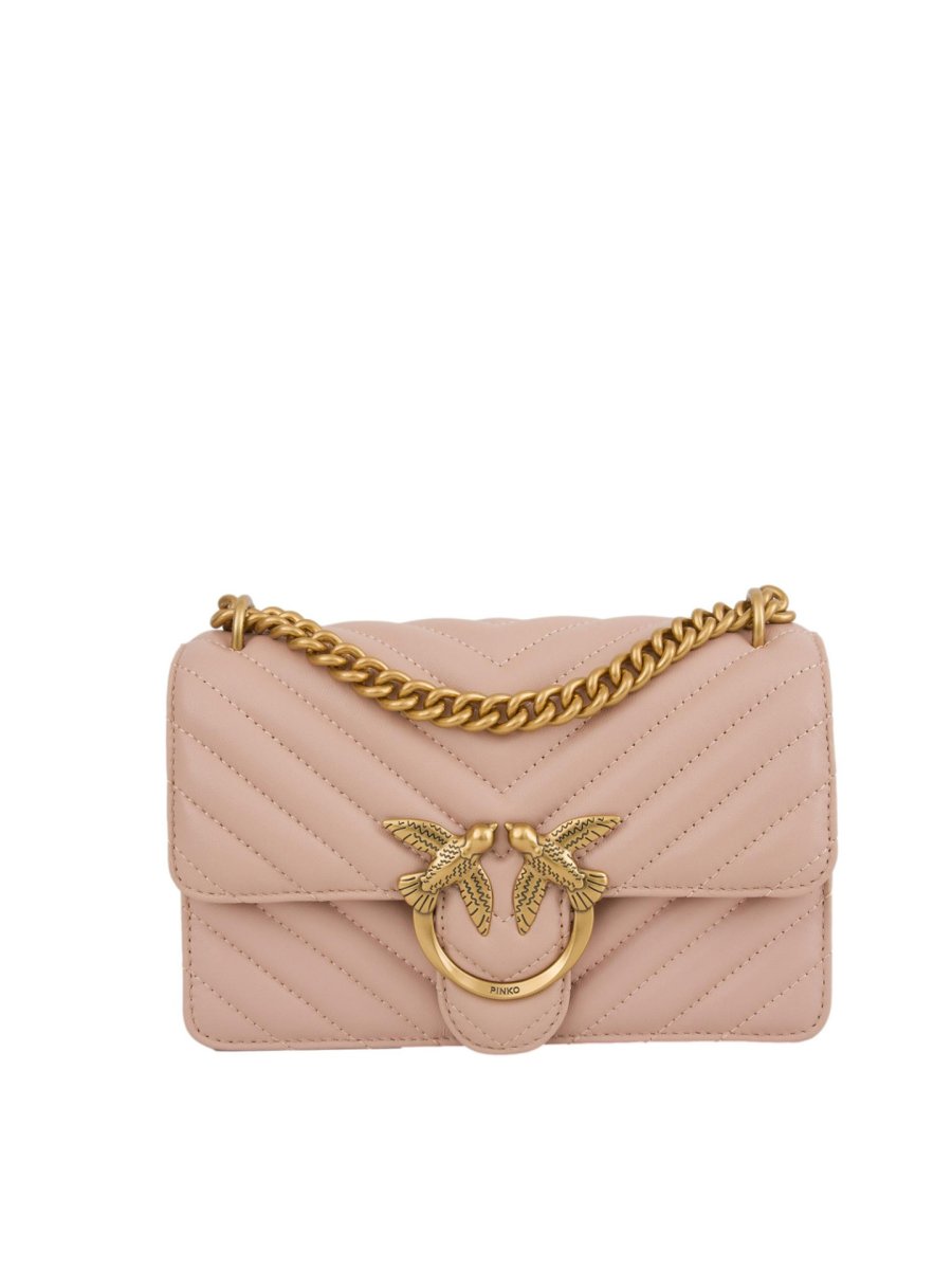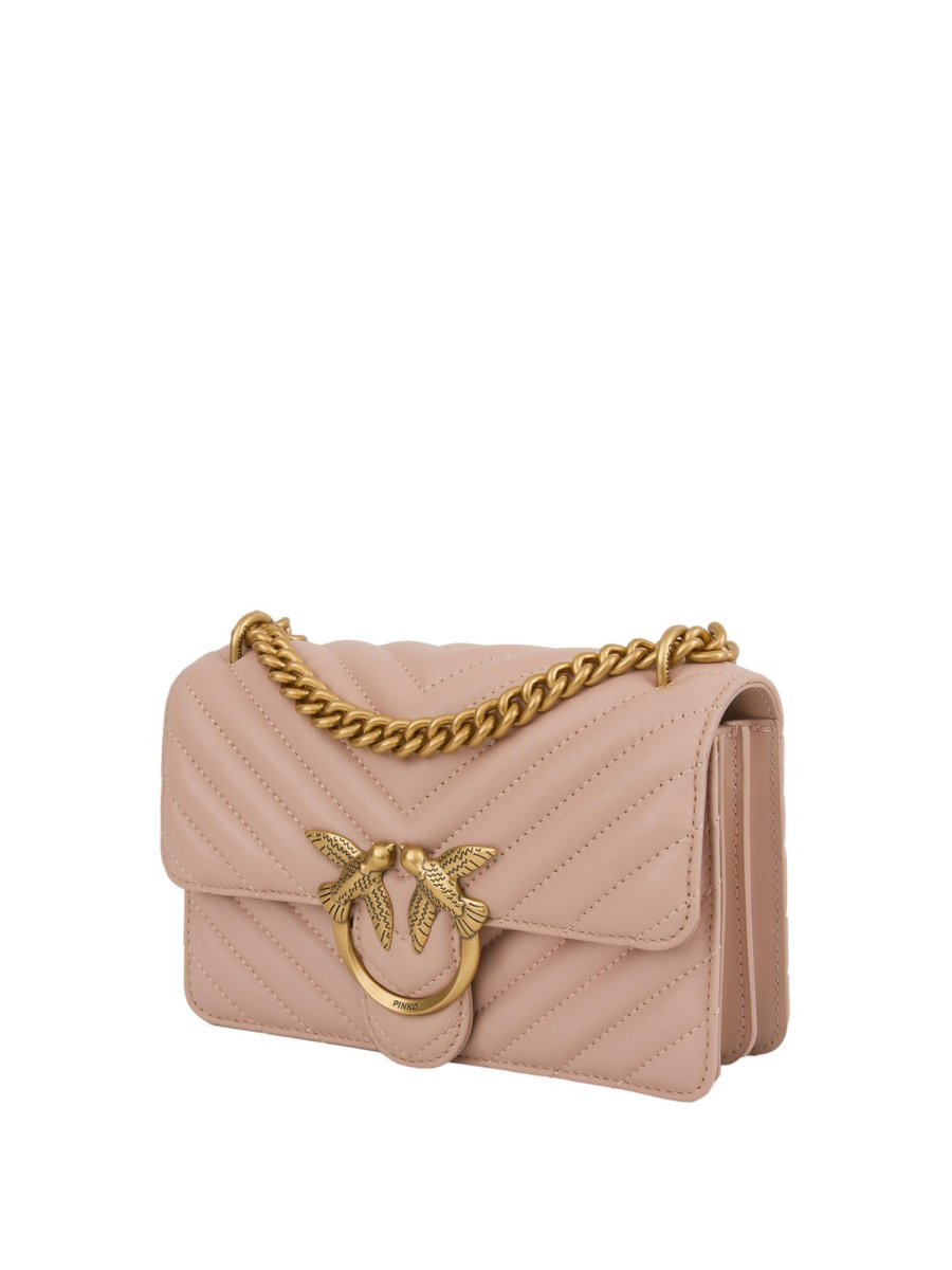 Mini Love Bag One in nappa trapuntata con motivo chevron. La chiusura è completata dall'iconica fibbia in metallo Love Birds Diamond Cut in metallo. L'interno è foderato in microfibra scamosciata e comprende tramezza chiusa con zip e tasca a parete in pelle. La tracolla combina la classica catena rotonda al pratico spallaccio in pelle regolabile.
