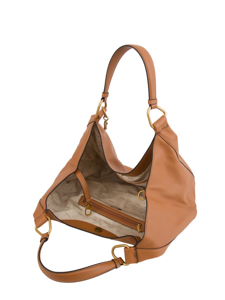 Borsa a spalla Guess Jeans realizzata in simil pelle, chiusura con bottone automatico, metalleria color oro, charm logo alla base del manico, e triangolo logo in metallo frontale. Misure 38x31x13 cm.
