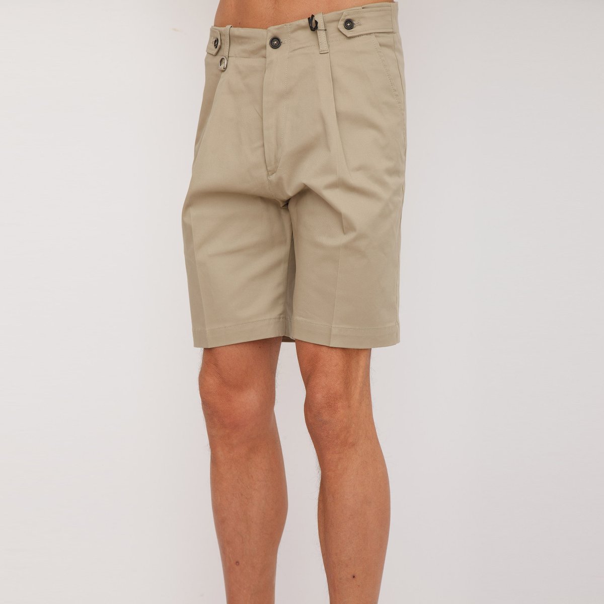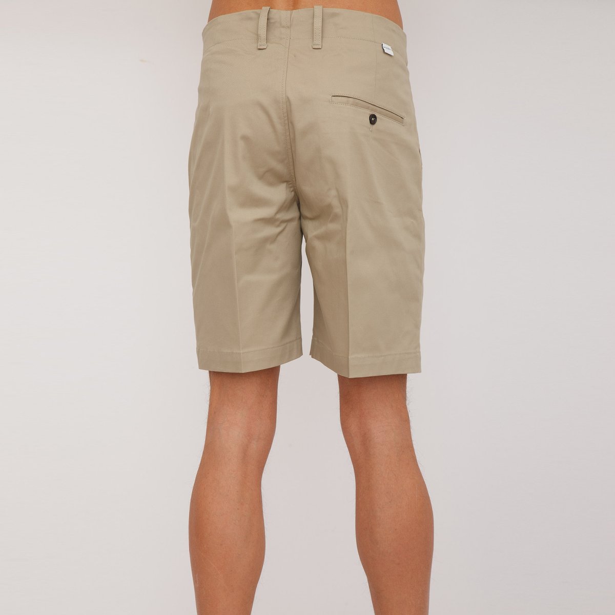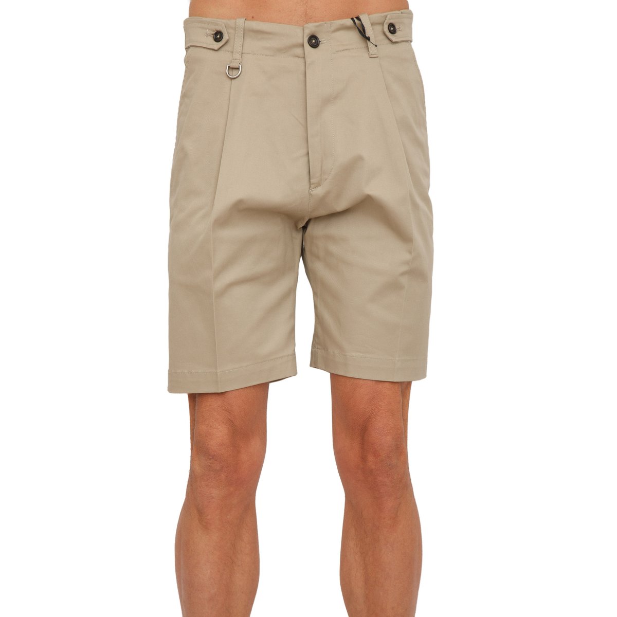 Bermuda sartoriale in gabardina di cotone, vestibilità regolare, cavallo basso, patta con zip, pinces anteriore, regolatore su vita con bottoni, tasca posteriore a filetto con bottone e anello di metallo con logo inciso su passante anteriore.