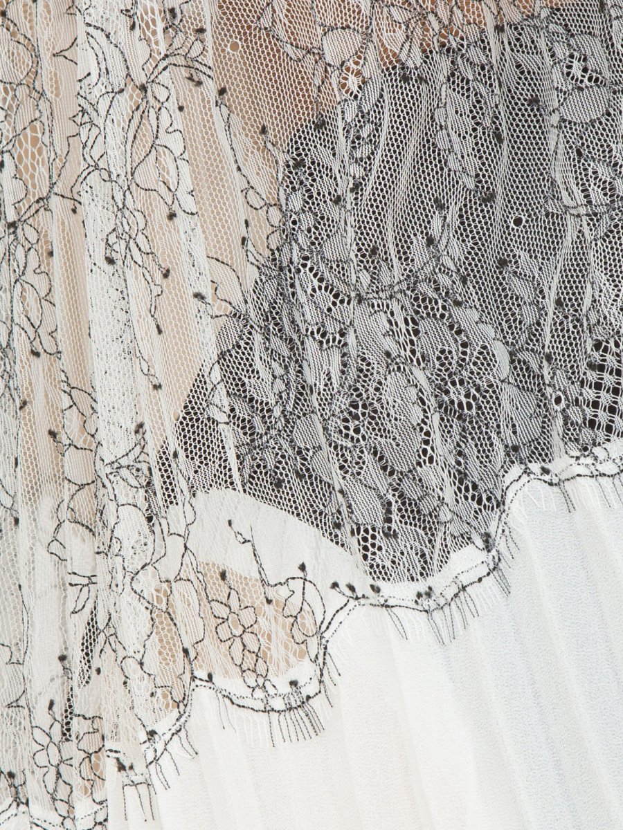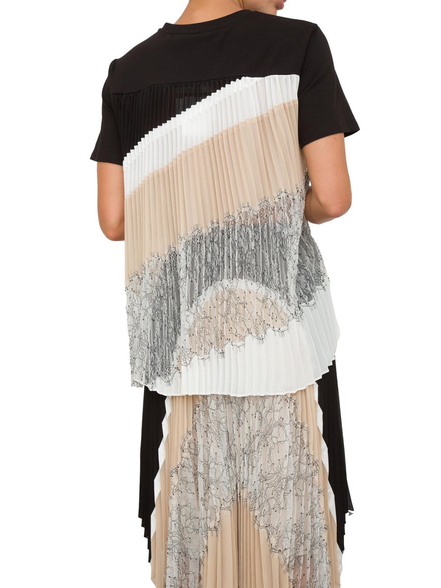 T-shirt in jersey davanti con retro in georgette plissé e pizzo, girocollo, maniche corte, fondo asimmetrico.