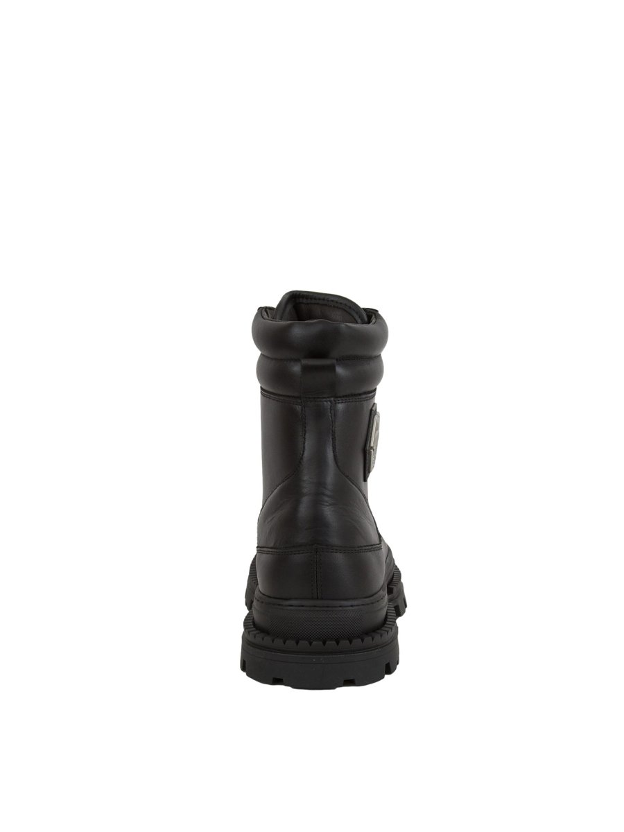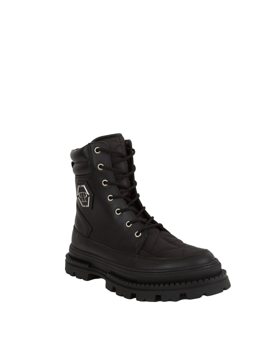 Scarponcini anfibi Philipp Plein realizzati in pelle, tomaia di vitello con impunture a disegno geometrico, PP Hexagon di metallo applicato su lato esterno del gambale, intersuola di materiale gommato ultraleggero con funzione ammortizzante e battistrada con carrarmato di gomma per un grip ottimale.