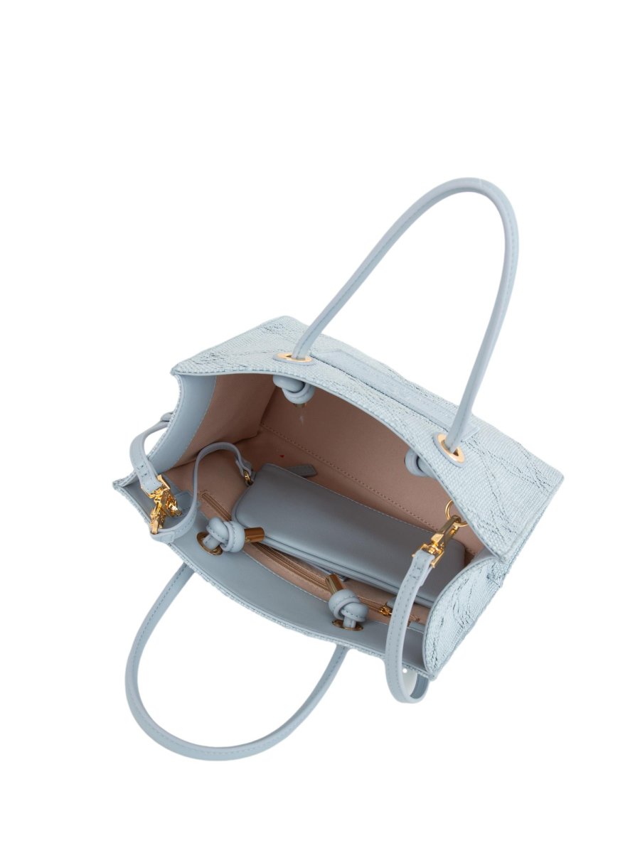 Маленька сумка-тоут Elisabetta Franchi із жакардової рафії з ромбоподібним візерунком, прикрашена золотими металевими деталями для легкого блиску. Вишита нашивка із логотипом завершує аксесуар. Розміри: 25 x 20 x 12 см
