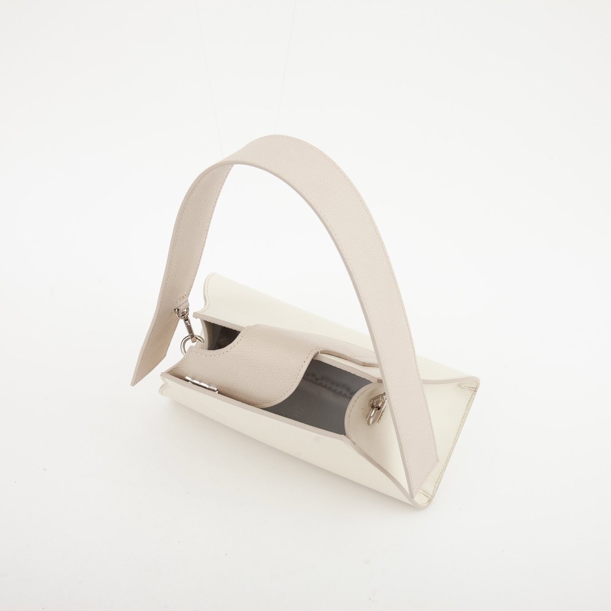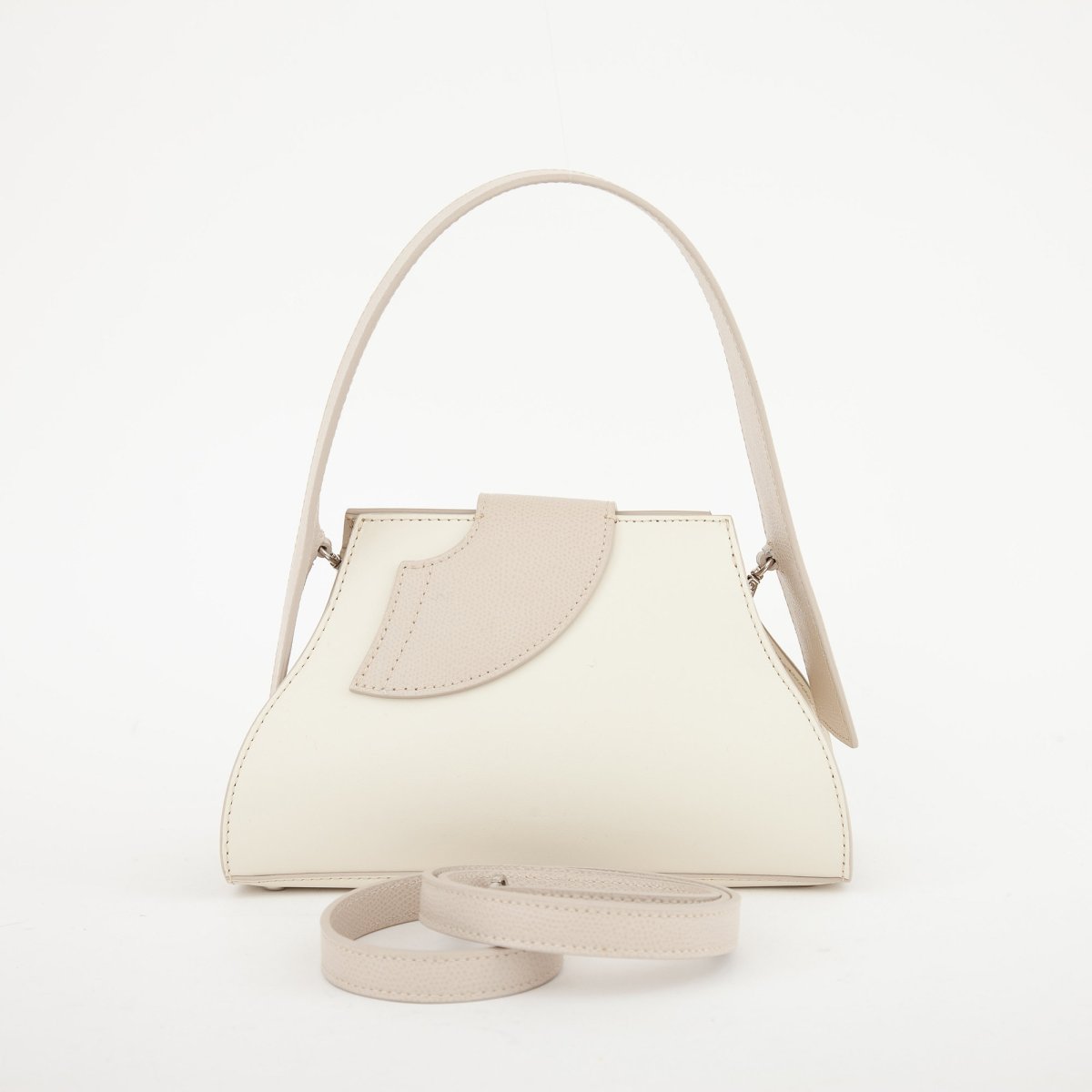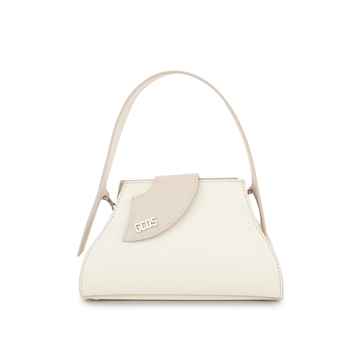 Borsa comma, dalla particolare forma svasata, formato medium, in pelle di vitello liscia. Patta curva asimmetrica in pelle con grana a contrasto, con logo GCDS in nichel lucido sull'estremità e bottone calamitato. Manico in pelle con grana con moschettoni semi nascosti. Internamente, fodera con logo jacquard e tasca porta carte con logo impresso a caldo. Fondo con 4 piedini in nichel lucido.