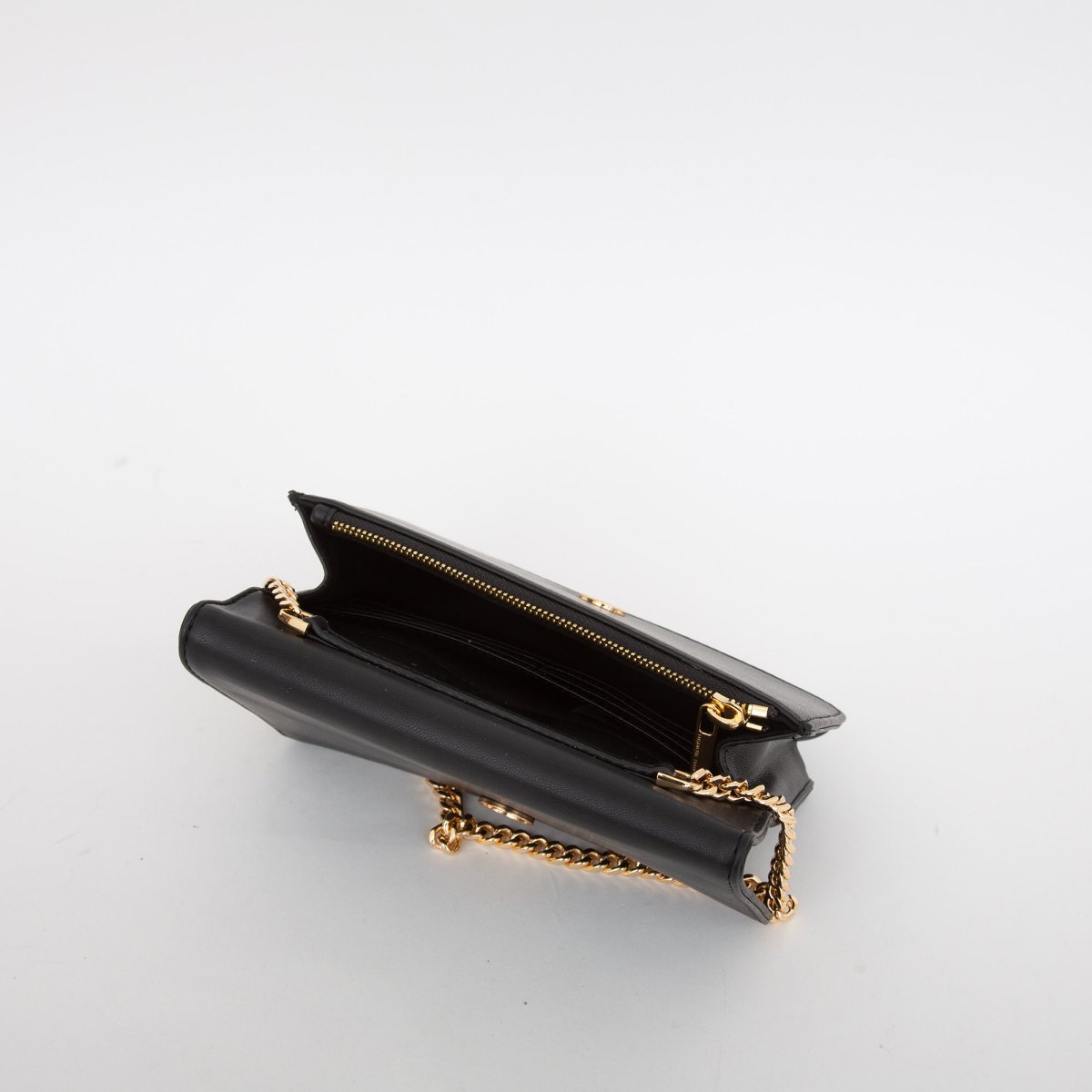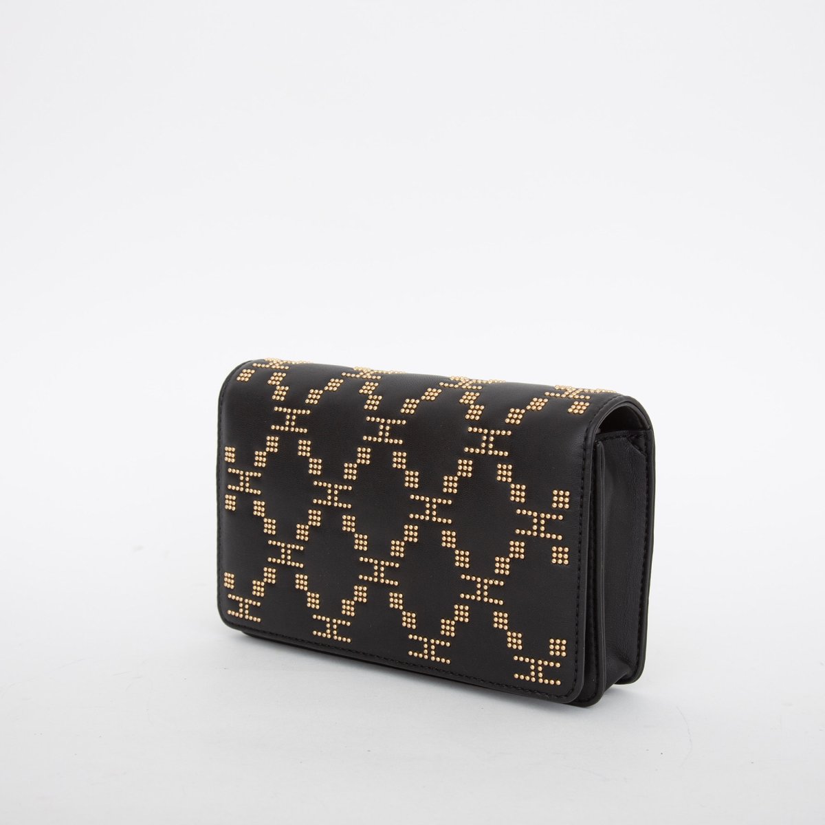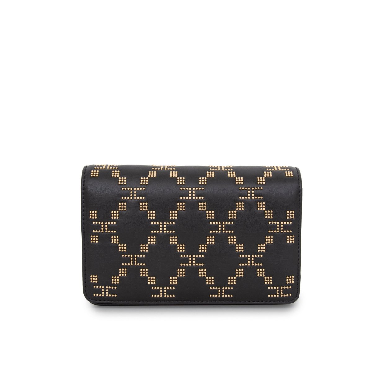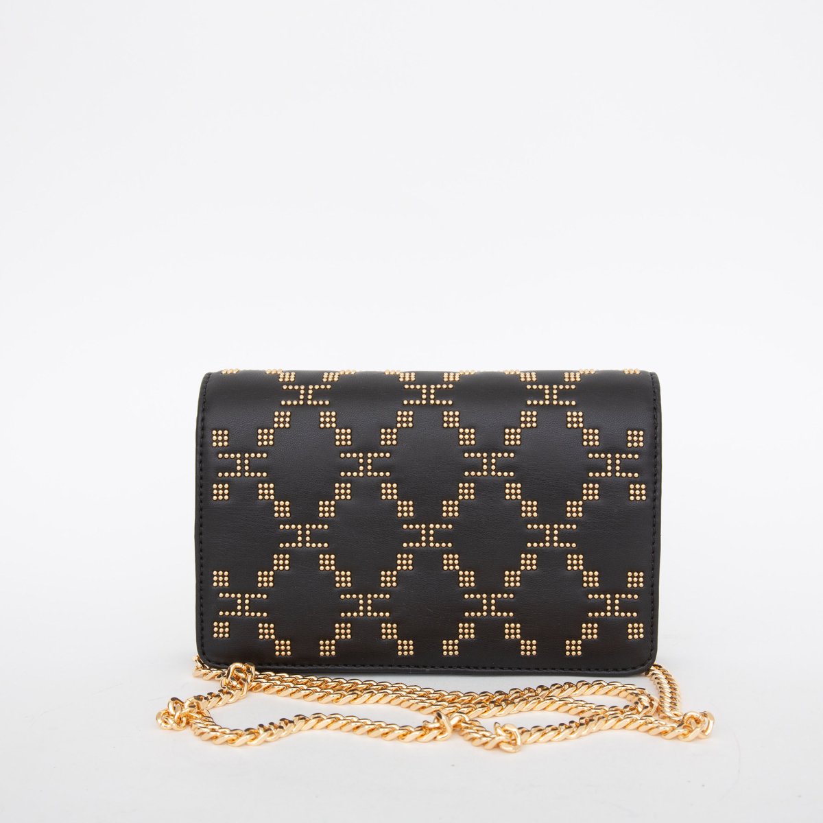Wallet on chain in pelle sintetica con motivo di microborchie. Tracolla in mini catena groumette in metallo oro. Fodera in polysuede con scomparto interno porta carte di credito e taschino con zip. L 19 x H 12 x P 4 cm.