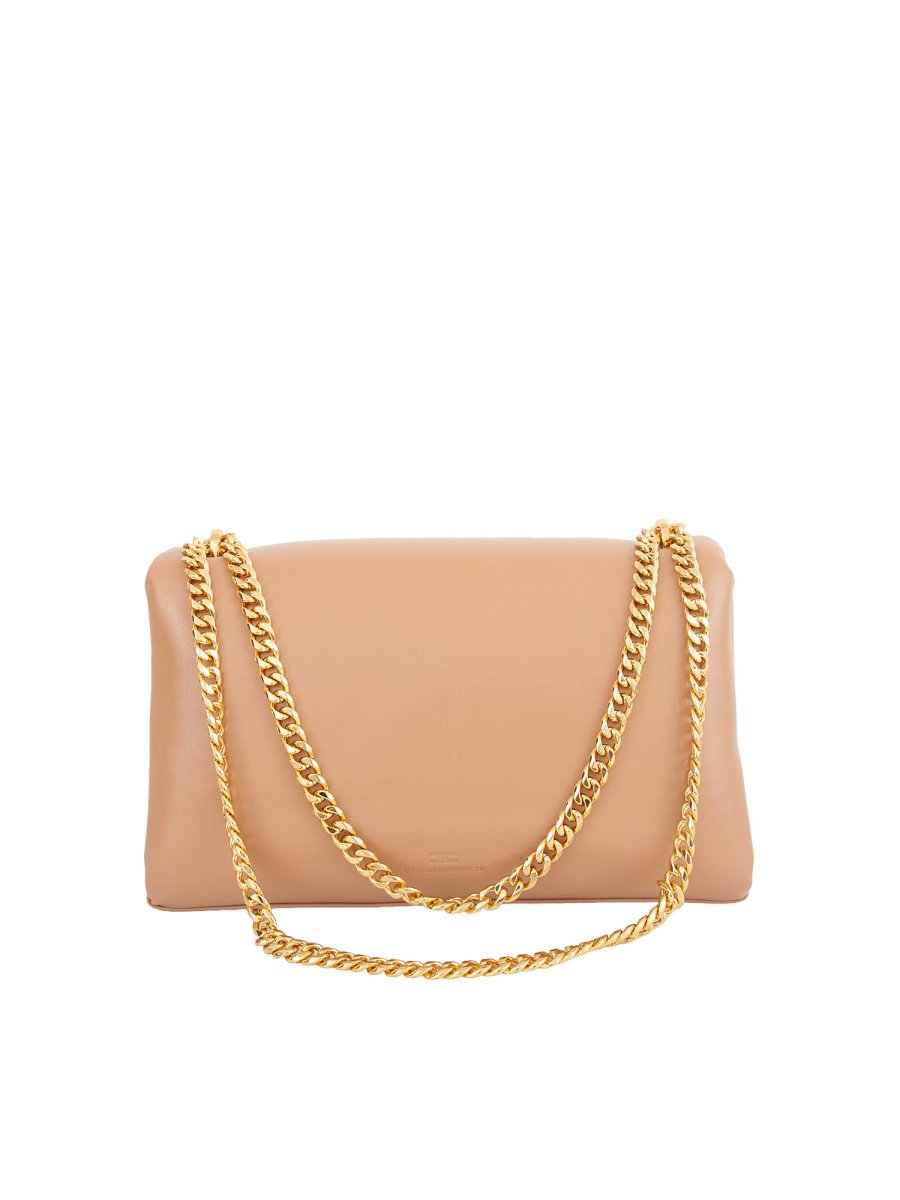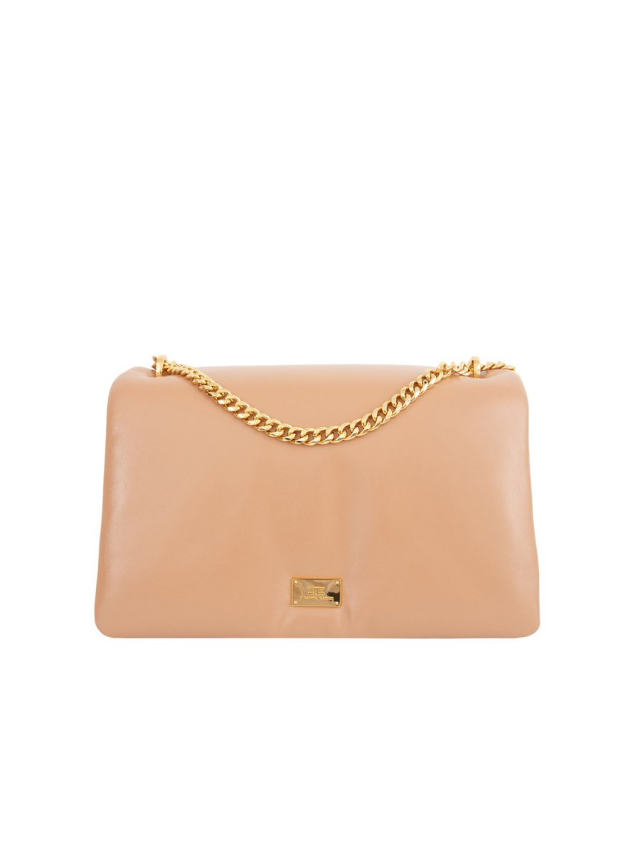 Borsa puffy grande Elisabetta Franchi in materiale sintetico effetto lucido stropicciato. È caratterizzata da placca logo in metallo dorato e catena regolabile dalla portabilità spalla e tracolla.