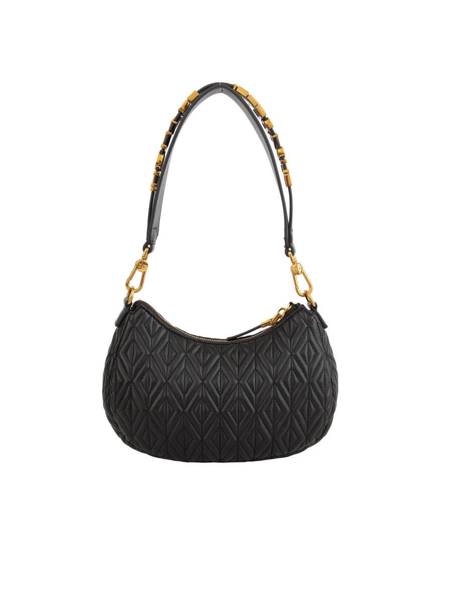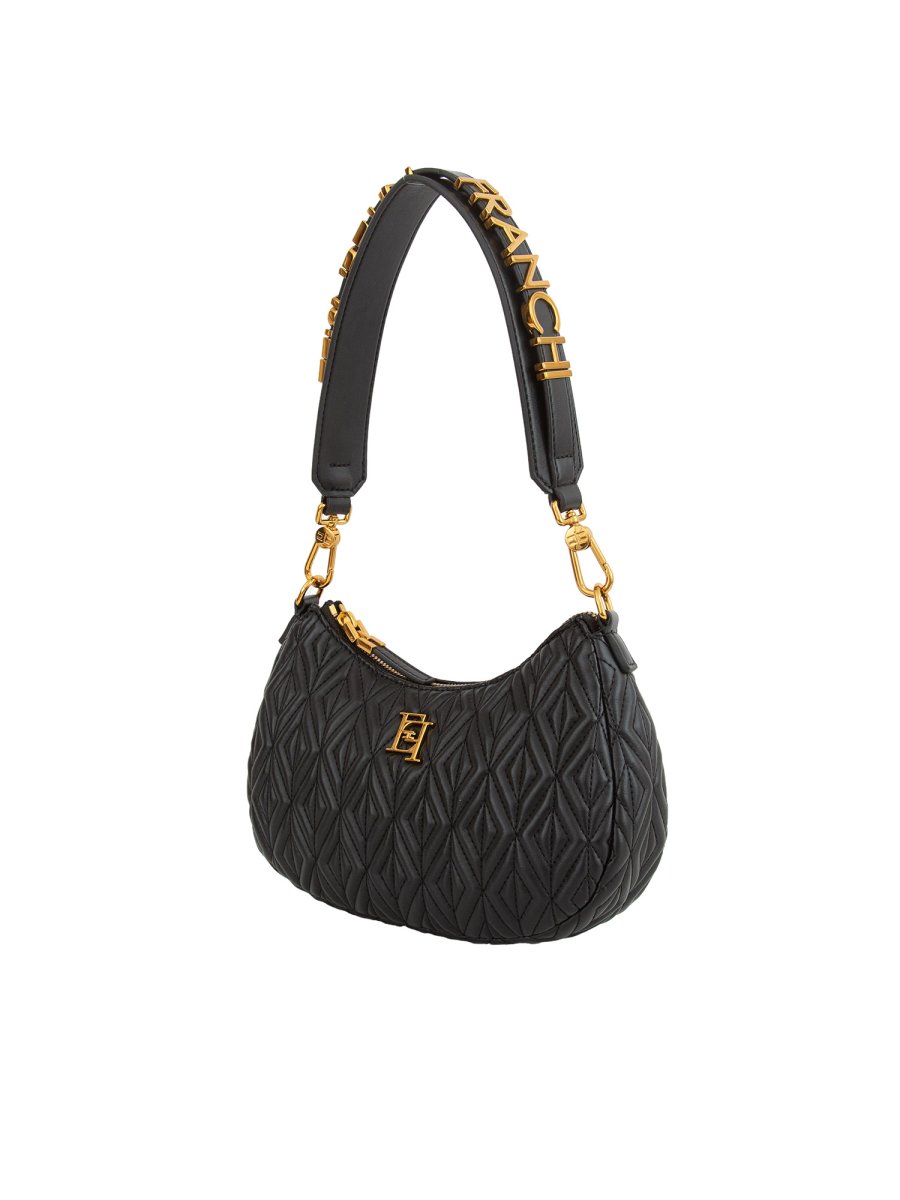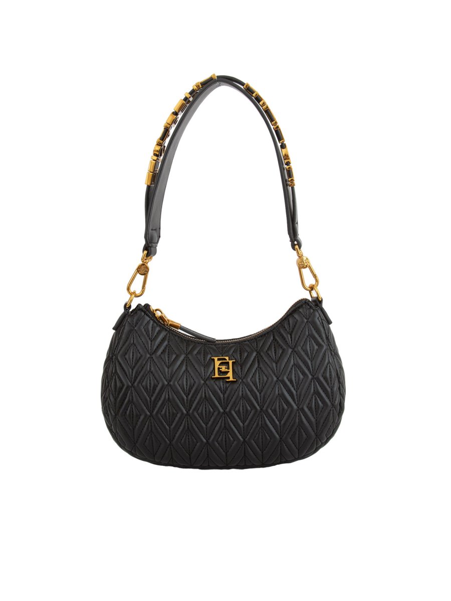 Borsa a spalla Elisabetta Franchi in materiale sintetico effetto nappa con motivo rombi matelassé all-over. È caratterizzata da placca logo e lettering su spallaccio in metallo dorato anticato e chiusura con zip.