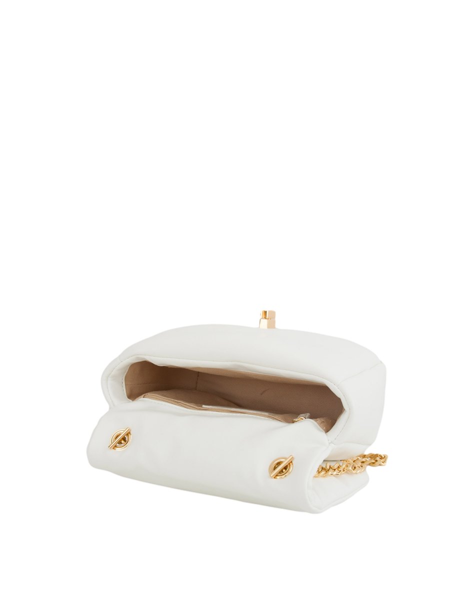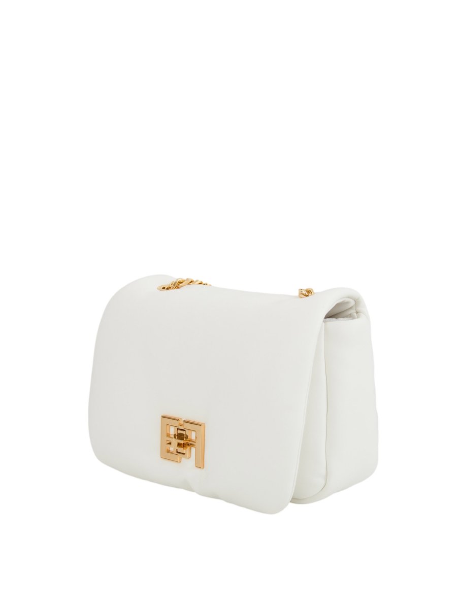 Borsa puffy Elisabetta Franchi in materiale sintetico effetto nappa. È caratterizzata da chiusura a patta con placca logo in metallo dorato e tracolla in catena. Dimensioni 20 x 15 x 7 cm