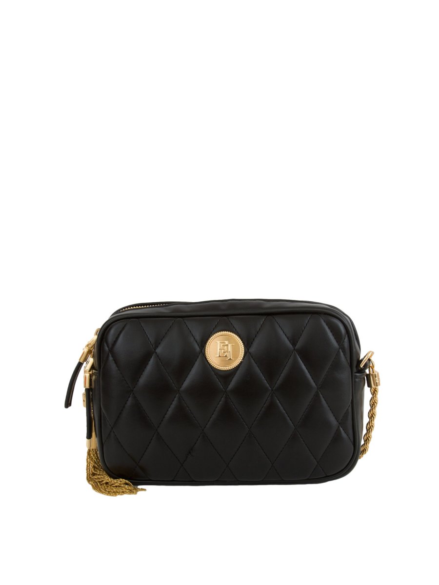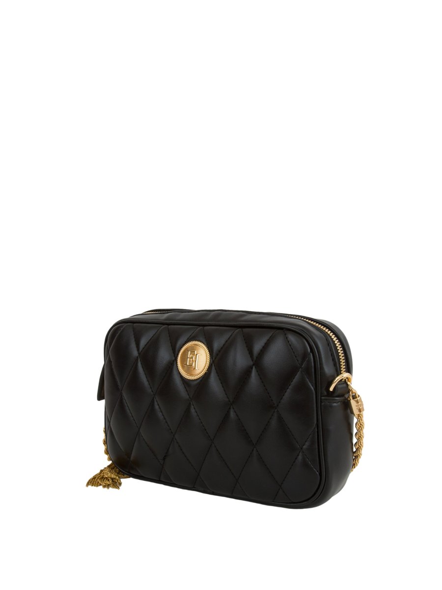 Borsa a spalla Elisabetta Franchi in materiale sintetico effetto nappa matelassé. È caratterizzata da chiusura con zip, tracolla fissa in catena torchon, pendente con frangia e placca logo in metallo dorato al centro davanti. Dimensioni 19,5 x 13,5 x 5 cm