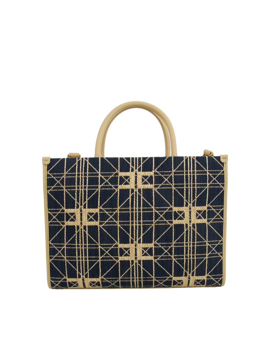 Shopper media in tessuto jacquard e dettagli in tessuto effetto pelle. È caratterizzata da tracolla di servizio per portabilità a spalla. Dimensioni 32 x 24 x 12 cm