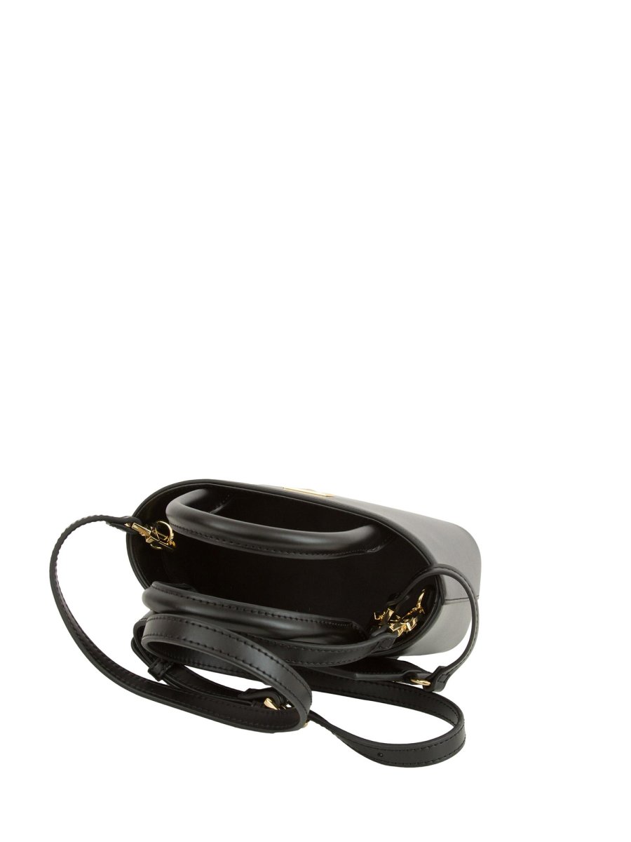 Shopper piccola in materiale sintetico lucido. È caratterizzata da placca logo smaltata in tono.