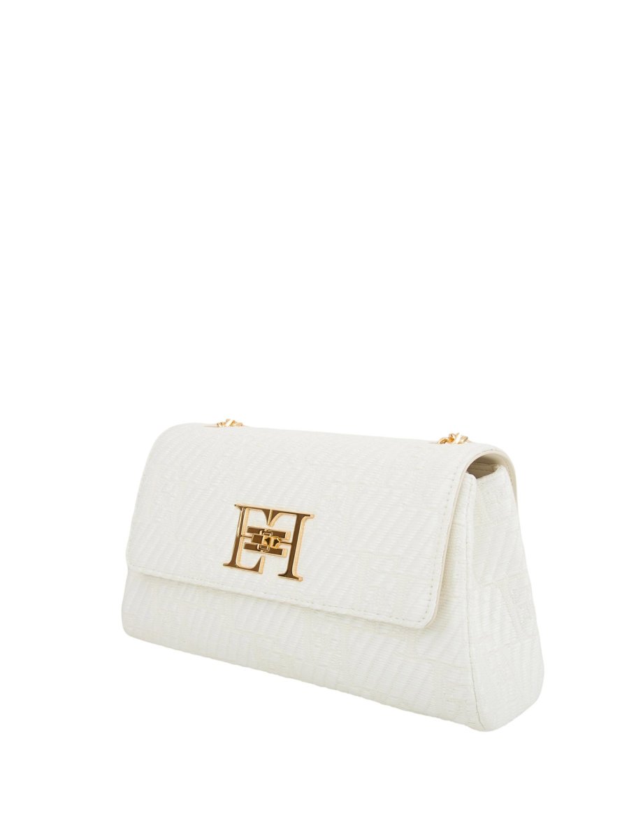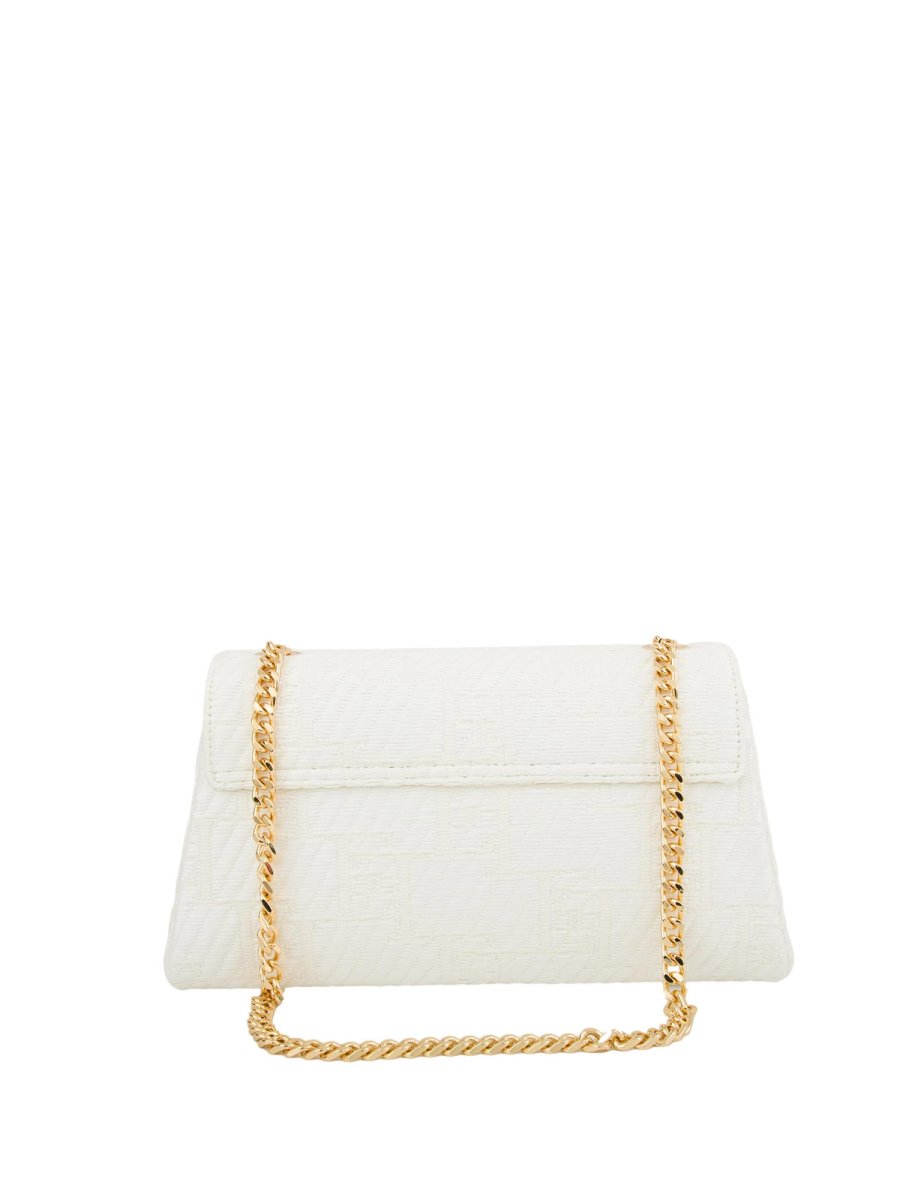 Borsa a spalla in rafia jacquard. È caratterizzata da tracolla in catena e chiusura a girello con logo in metallo dorato.