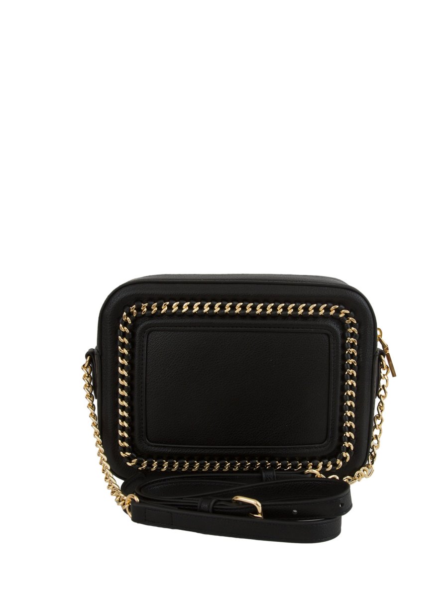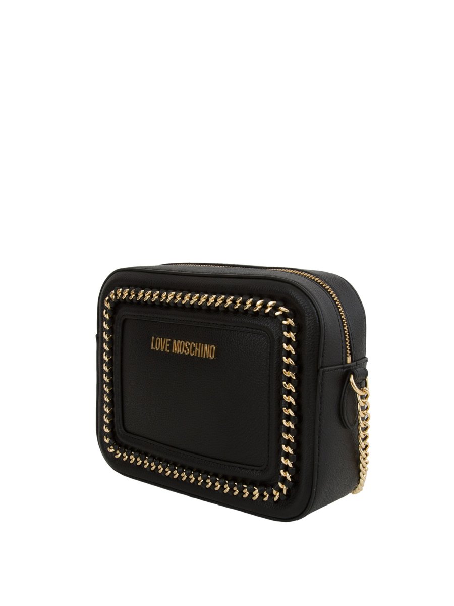 Borsa a spalla Love Moschino da donna in ecopelle zigrinata, modello crossbody compatto small con angoli smussati e chiusura zip superiore, logo lettering in galvanica oro sul lato anteriore, cornici in catena intrecciata sulle facciate e tracolla stretta regolabile in lunghezza con attacchi in catena oro. Misure: 25x8x16 cm