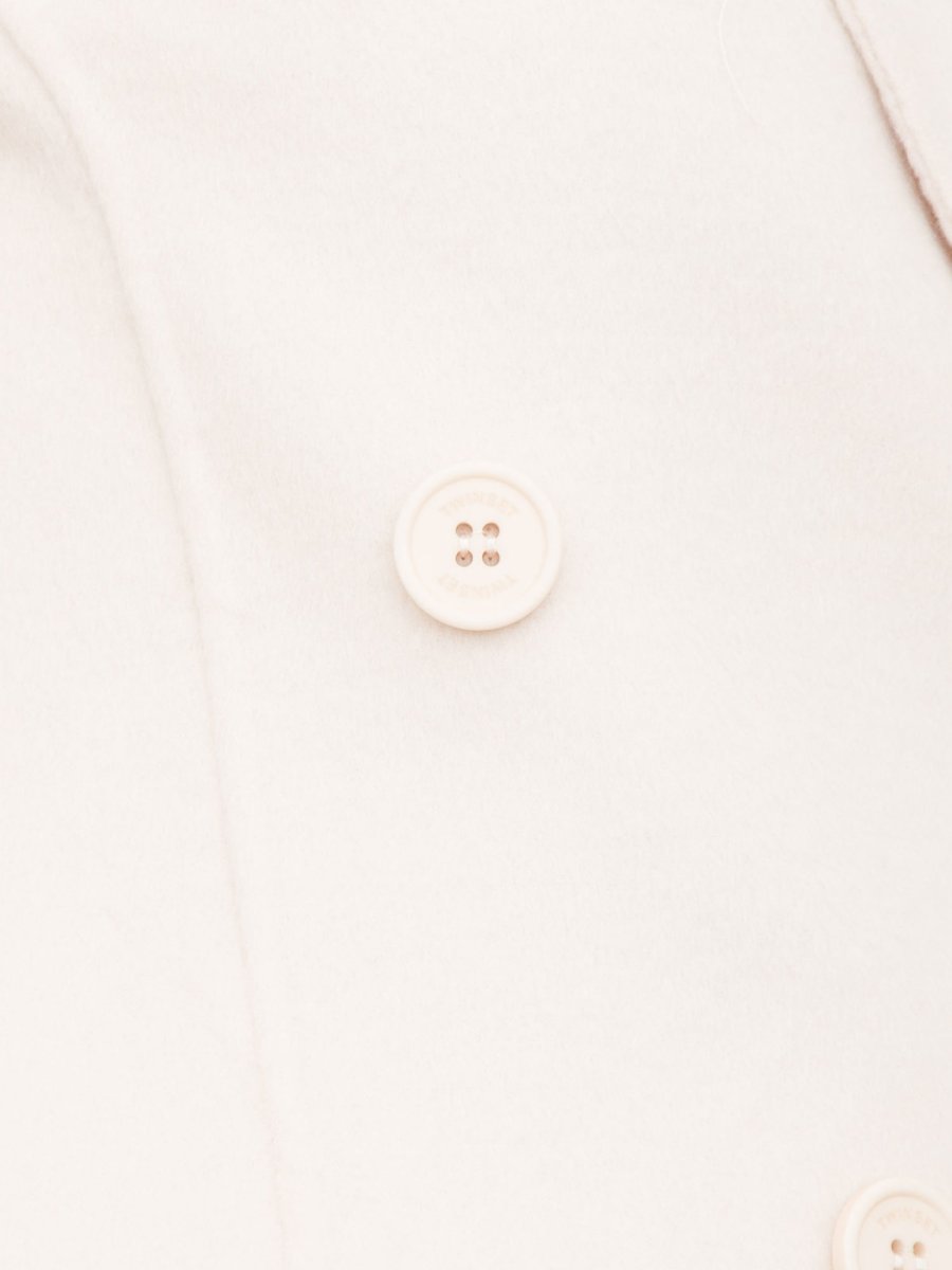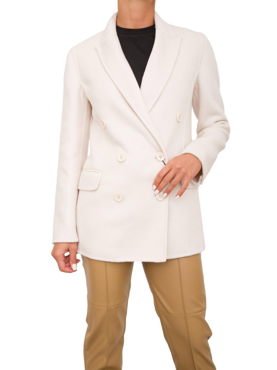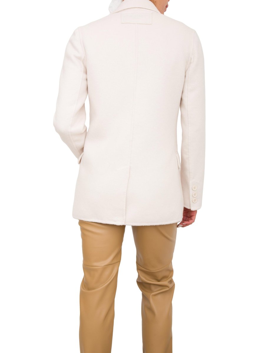 Куртка з подвійної вовняної тканини з чіткою лінією та плоскими швами всередині. Має комір з лацканами, двобортну застібку на ґудзики в тон, довгі рукави з розрізом і ґудзиками в тон, кишені з клапанами, розріз внизу на спині, вишитий логотип на кокетці, без підкладки, прямого крою.