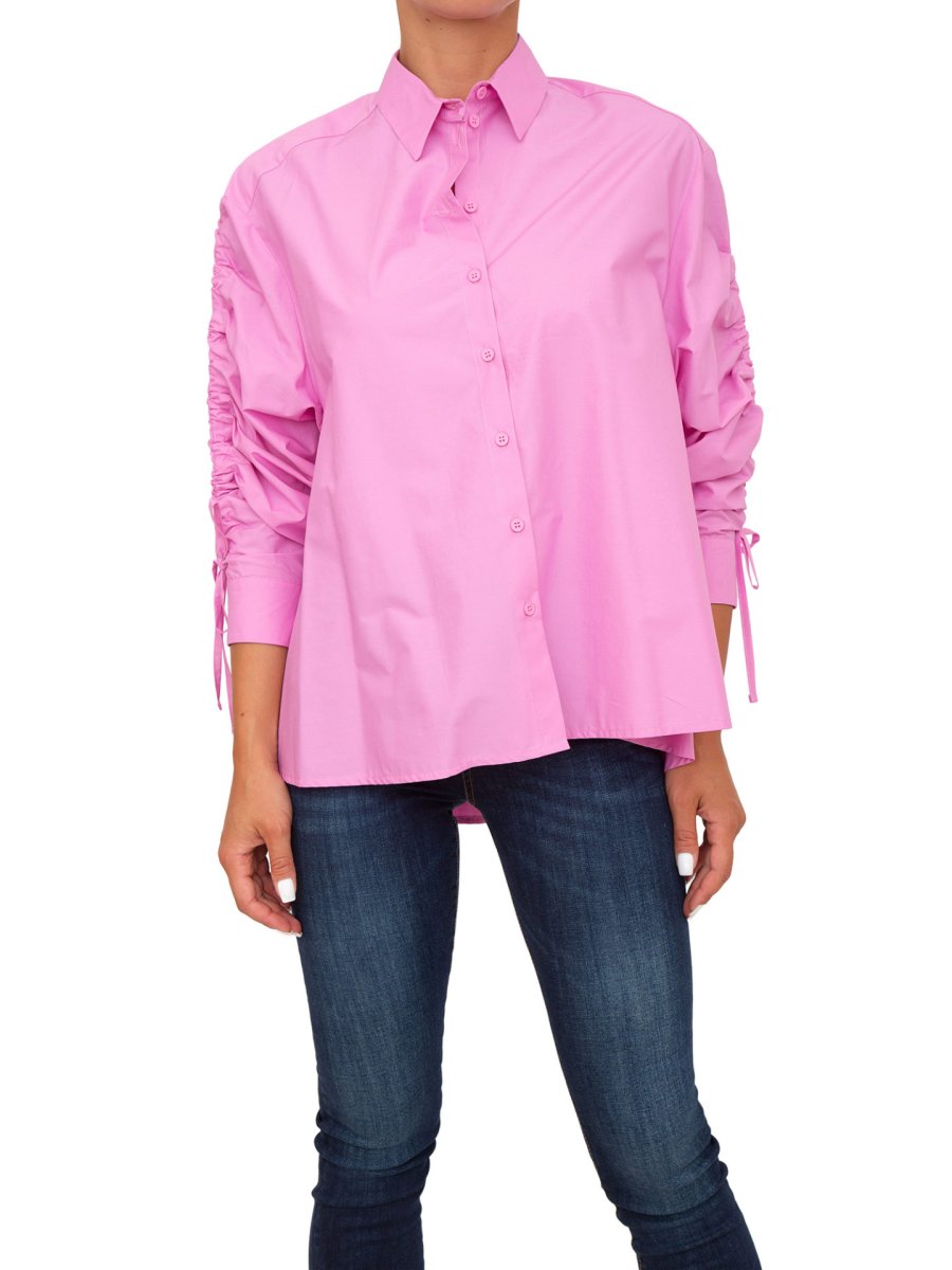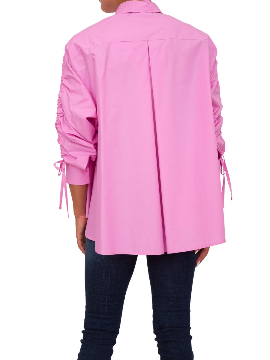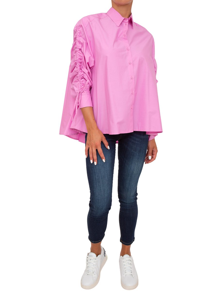Camicia Marella in popeline di cotone, linea over. Collo a camicia, maniche lunghe con giro sceso e dettaglio di coulisse verticale. Chiusura con bottoni. Fondo retro più lungo.