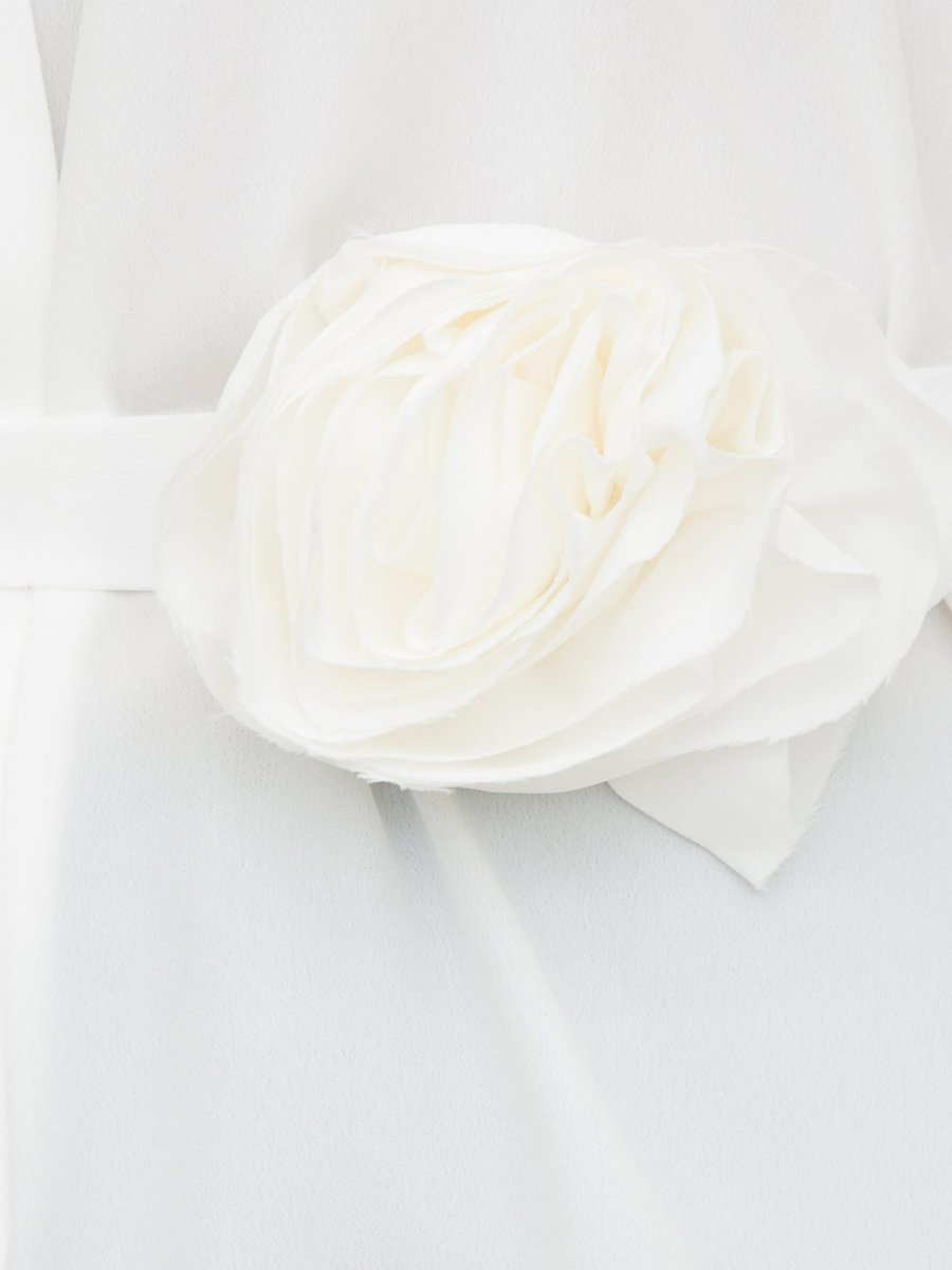 Camicia in crêpe de Chine misto seta, linea dritta con collo a camicia, maniche lunghe con polsino, chiusura con bottoni nascosti e accessorio con fiore per collo o vita.