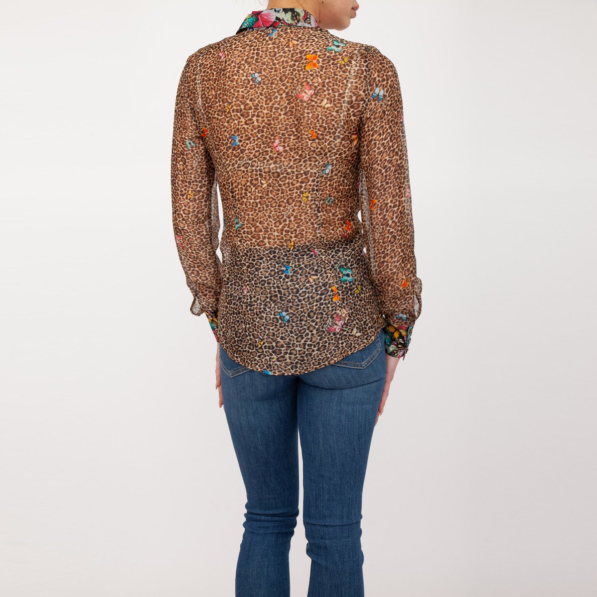 Camicia BLUGIRL in misto seta e viscosa, motivo farfalle multicolor su sfondo animalier. Linea regular. Maniche lunghe con polsino e bottone e collo a camicia classico. Chiusura con bottoni ricoperti, fondo arrotondato.