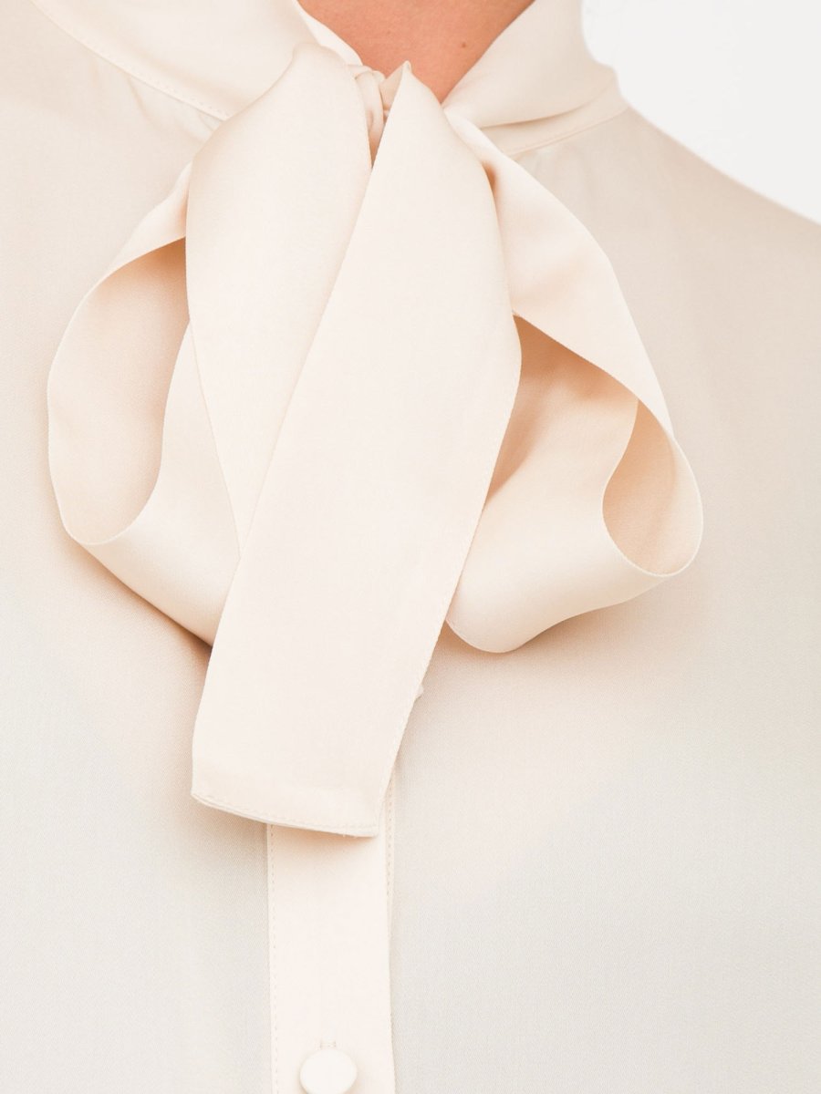 Атласна сорочка з ацетату та віскози з мандариновим коміром і вільними стрічками для зав’язування в бант. Застібка на ґудзиках із тканиною, довгі рукави з манжетами та гудзиками, овальний логотип T на спині, м’яка посадка.
