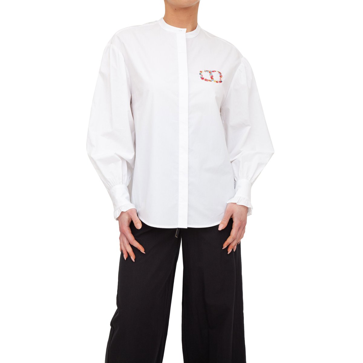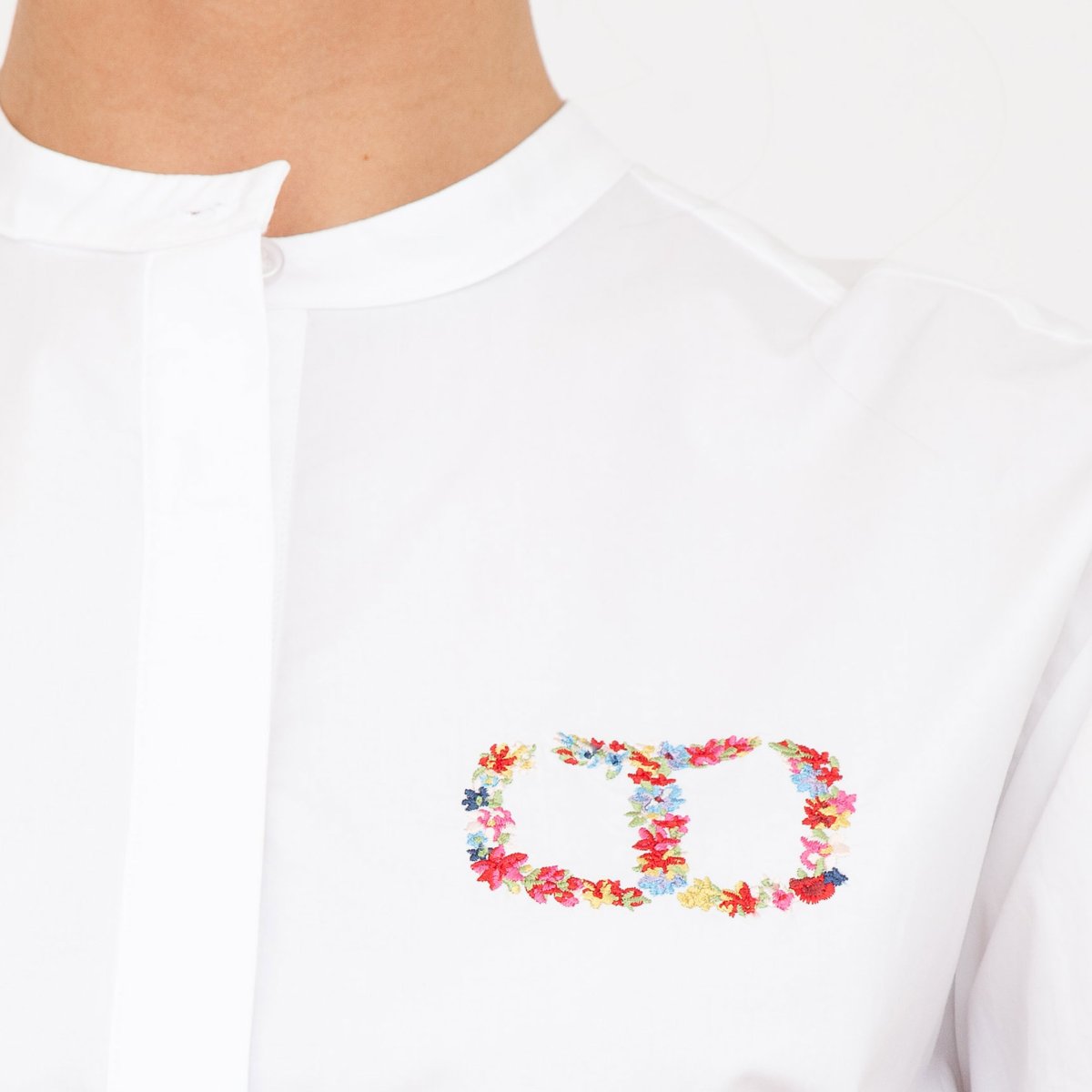 Camicia in popeline di cotone con ricamo logo Oval T floreale multicolor, maniche lunghe con polsini e volant.