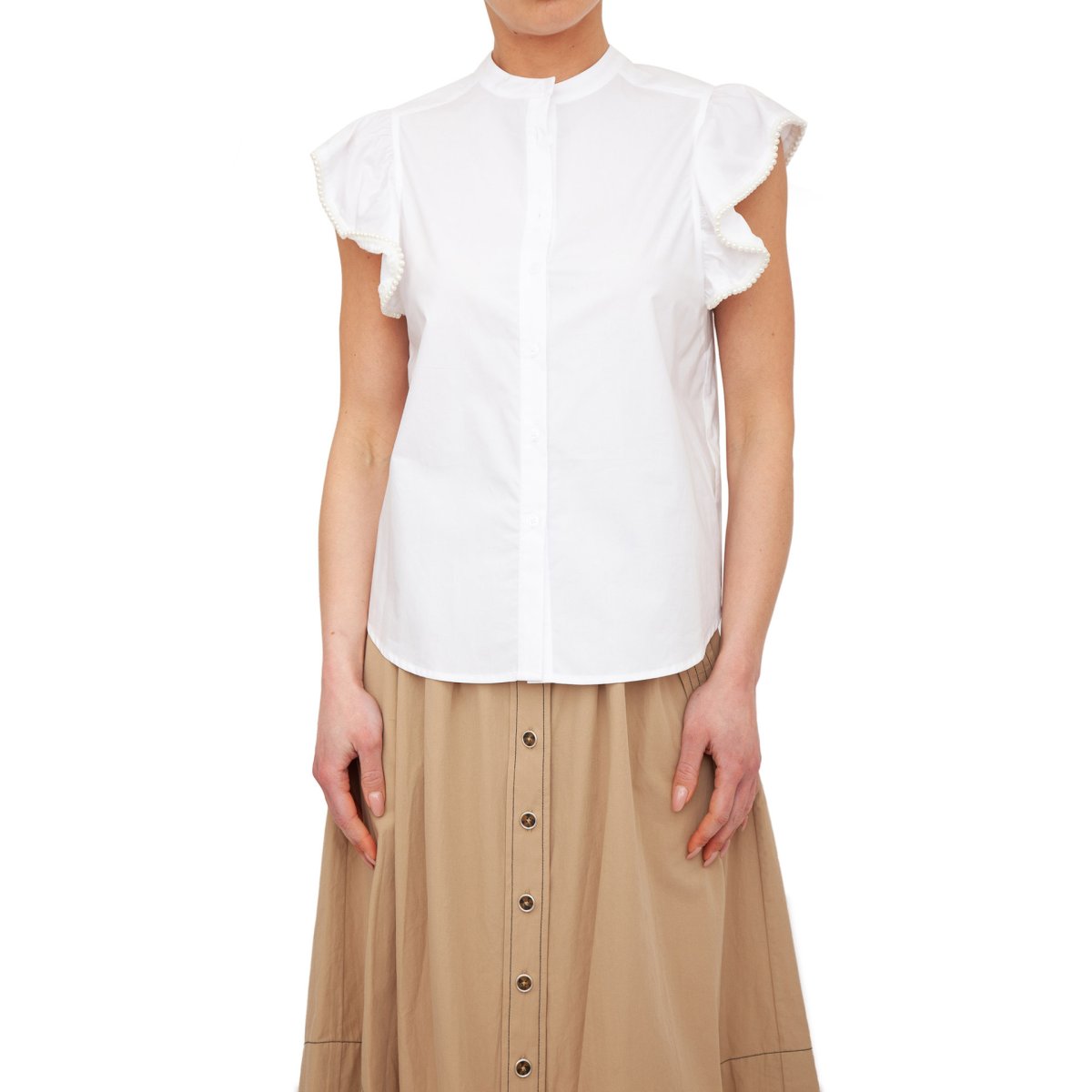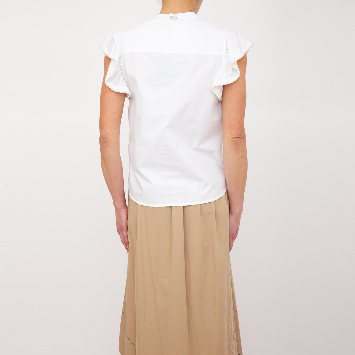 Camicia in popeline di cotone stretch, dalla linea dritta, con maniche ad aletta rifinite da volant e perle.