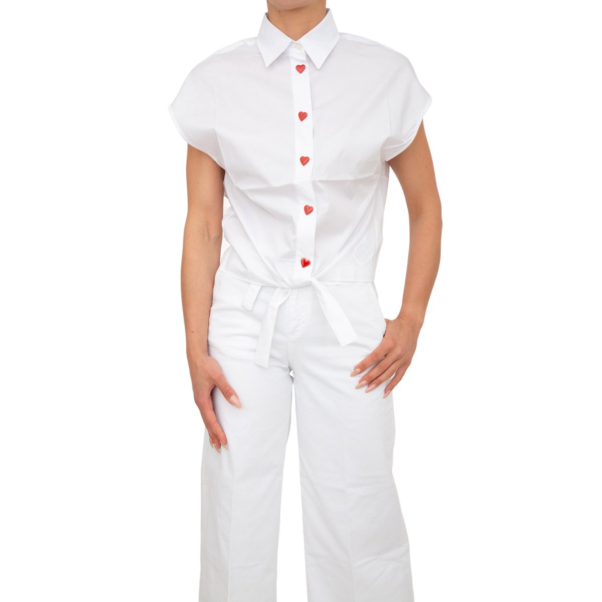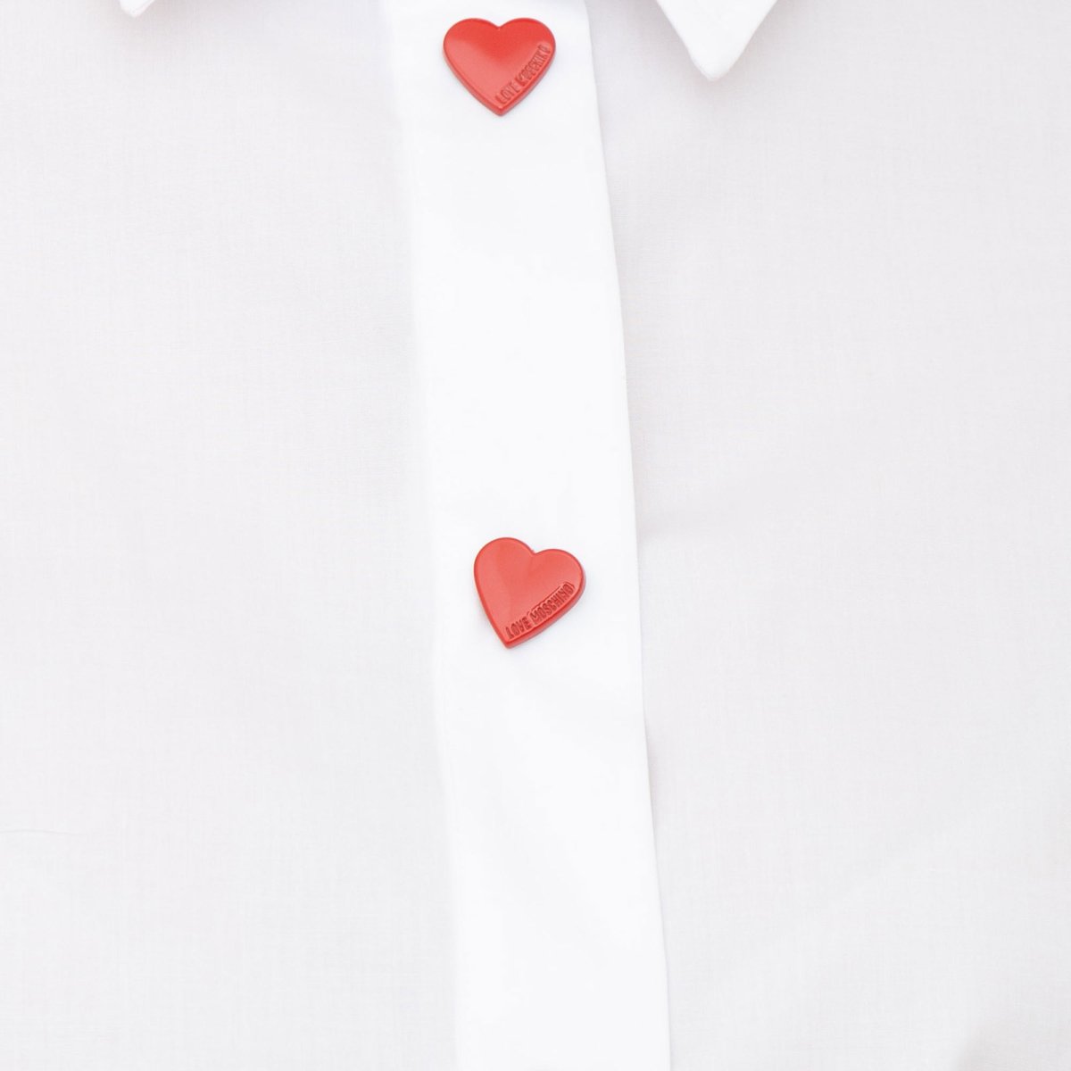 Camicia Love Moschino, bottoni a cuore, chiusura frontale con fiocco, colletto a punta, maniche ad aletta e orlo dritto.