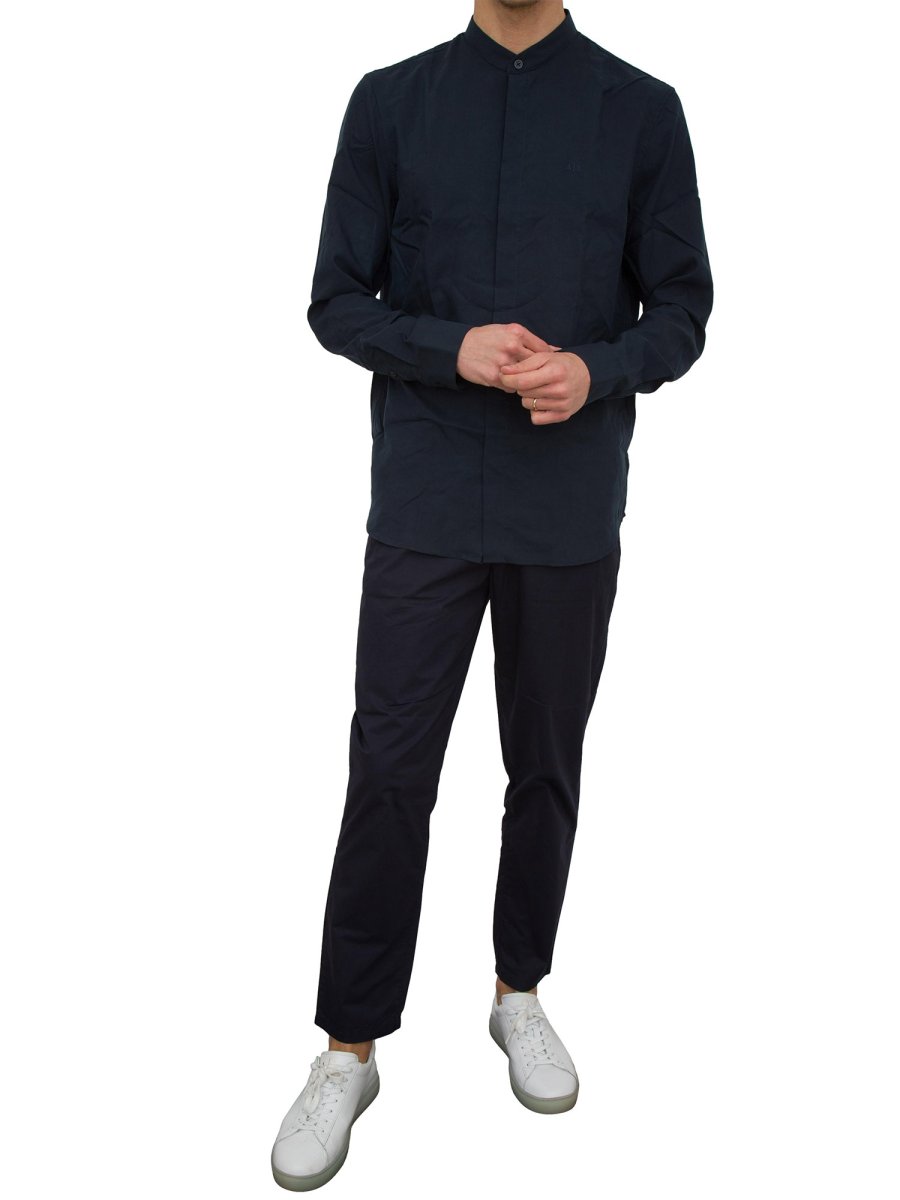 Camicia regular fit realizzata in in popeline stretch che presenta collo alla coreana, chiusura con bottoni e maniche lunghe con bottone.