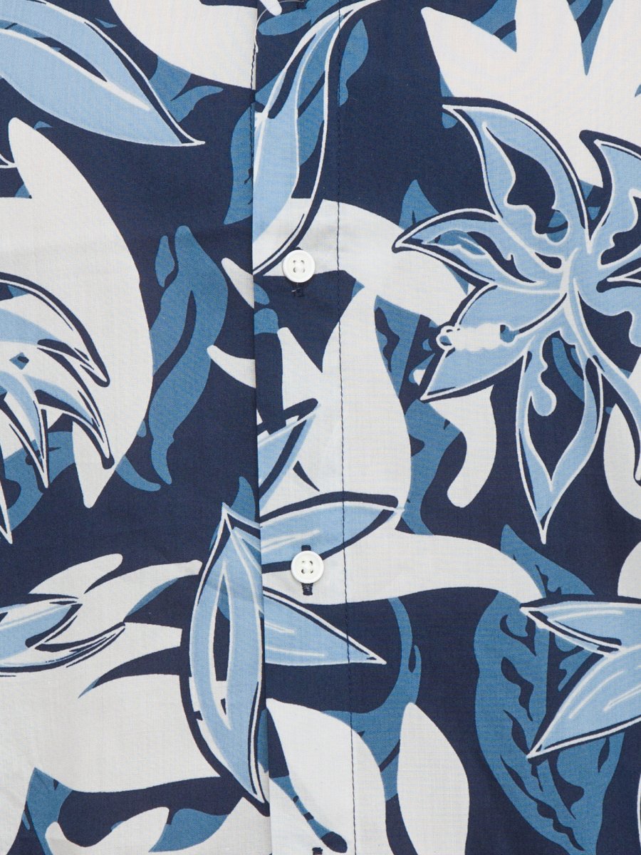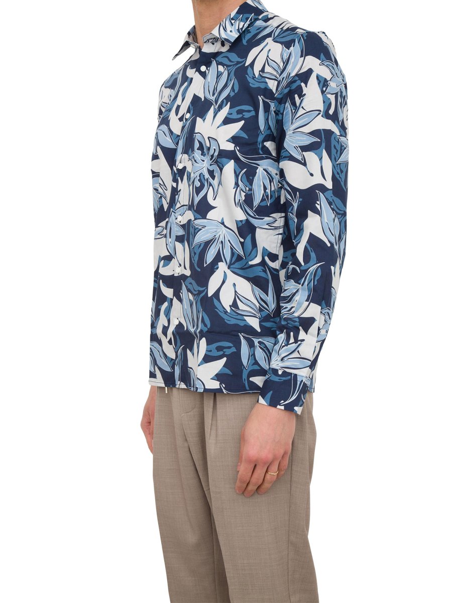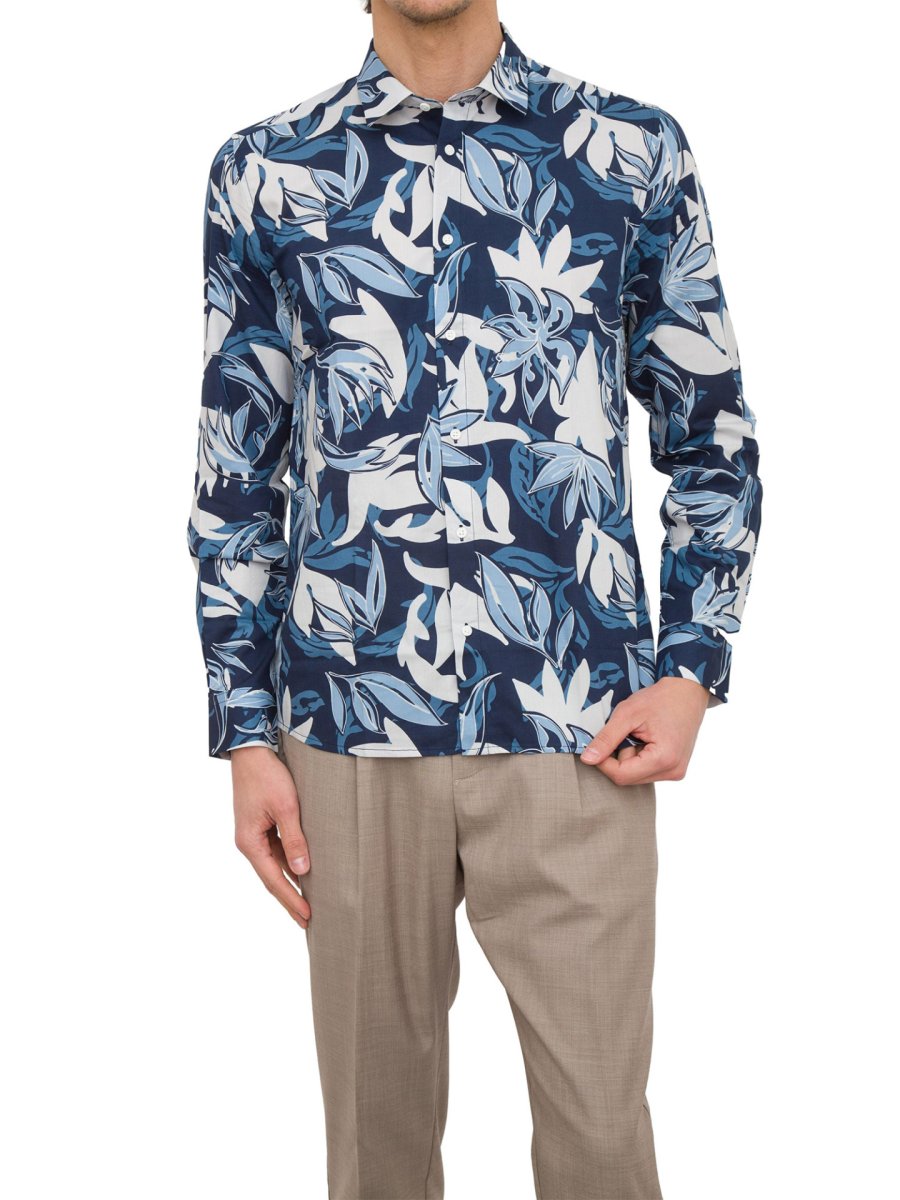 camicia manica lunga vestibilitá comoda con spacchetti laterali al fondo misto viscosa fantasia stampa logo sul retro.