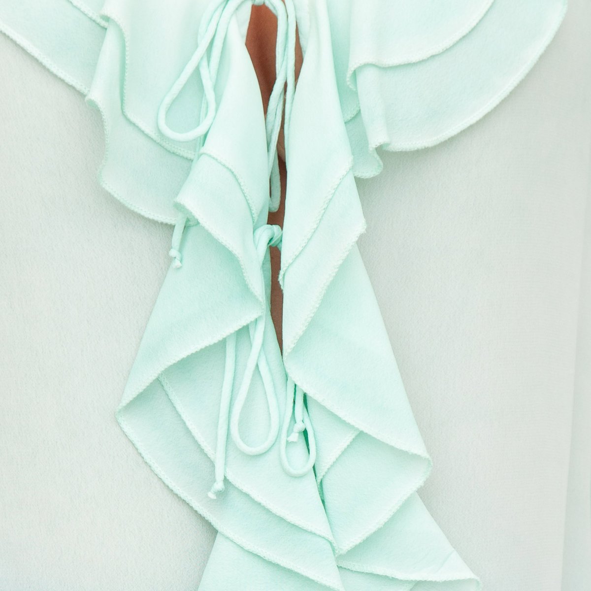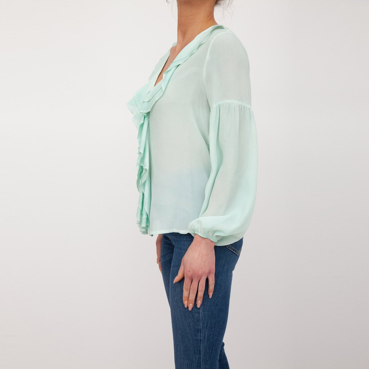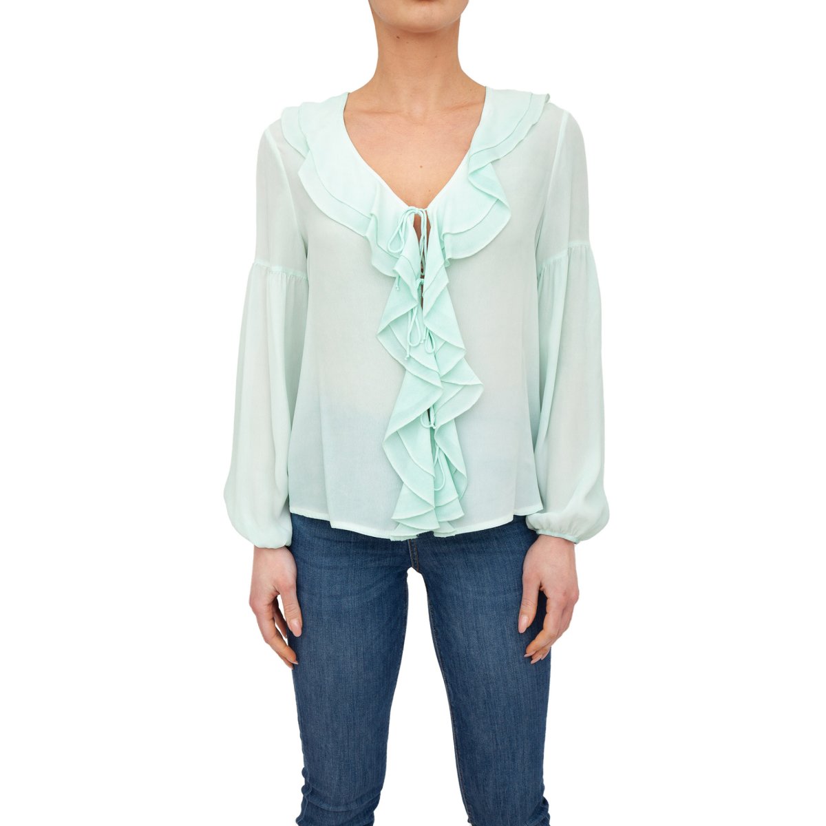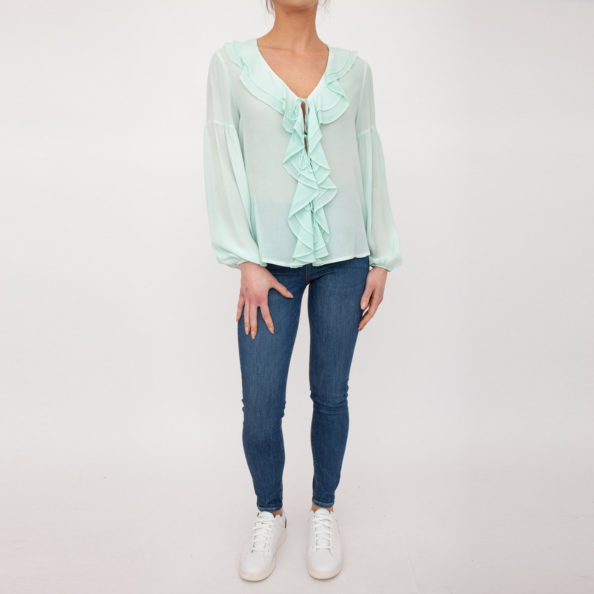 Blusa misto seta, scollo a v, manica lunga, vestibilità regular e allacciatura frontale.